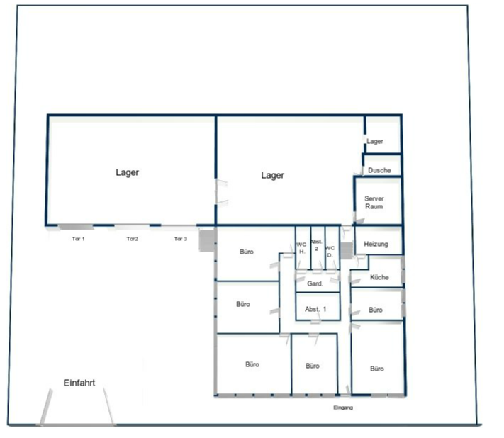 Ölheizung, Betonboden, Teppichboden, Magnetwand, eingebaute Beleuchtung, Serverraum, Teeküche, Büroausstattung. WCs`, Dusche, 3 Rolltore, Außenstellplätze, Büroräume, Hallenfläche, gute Zufahrt