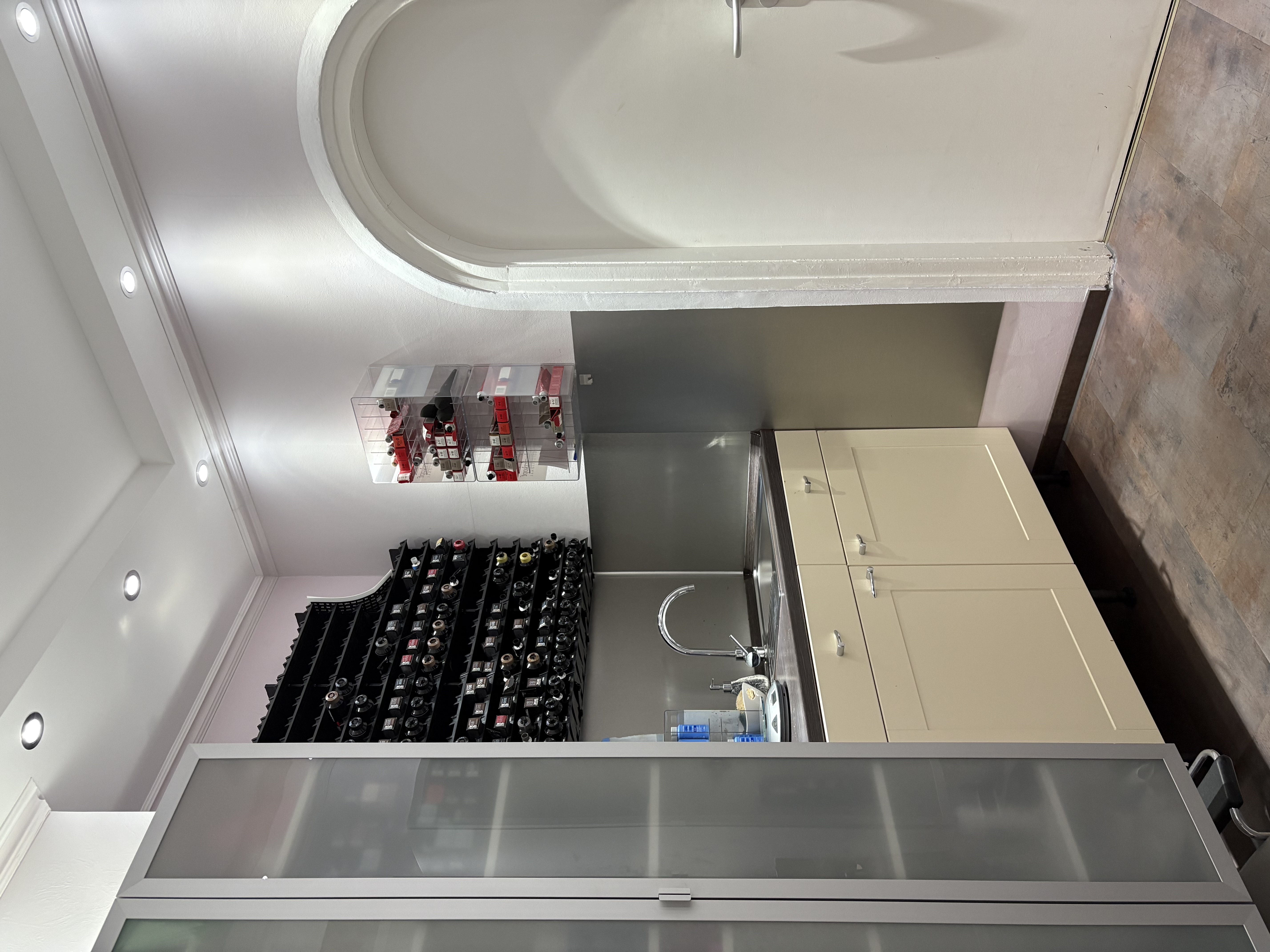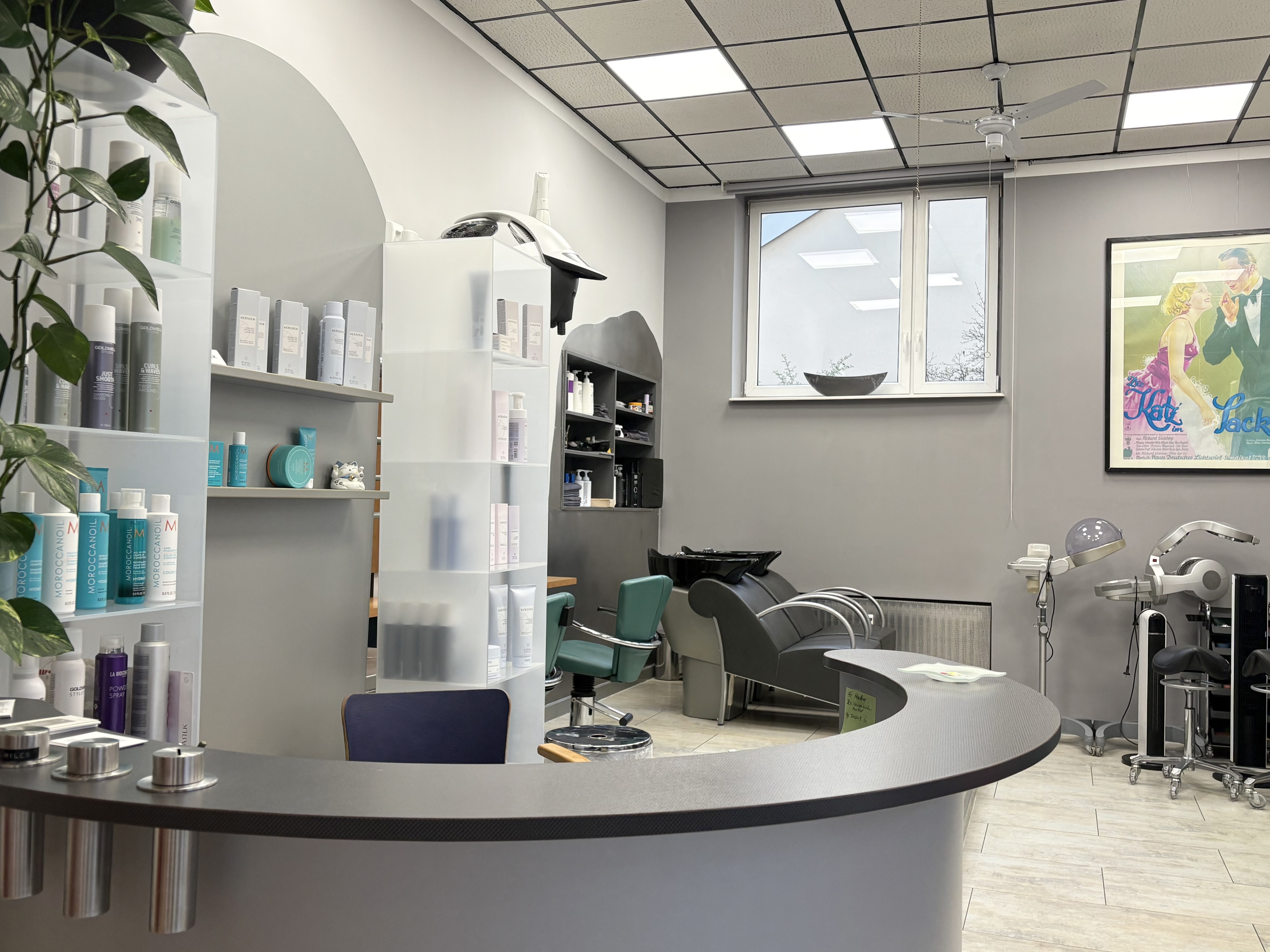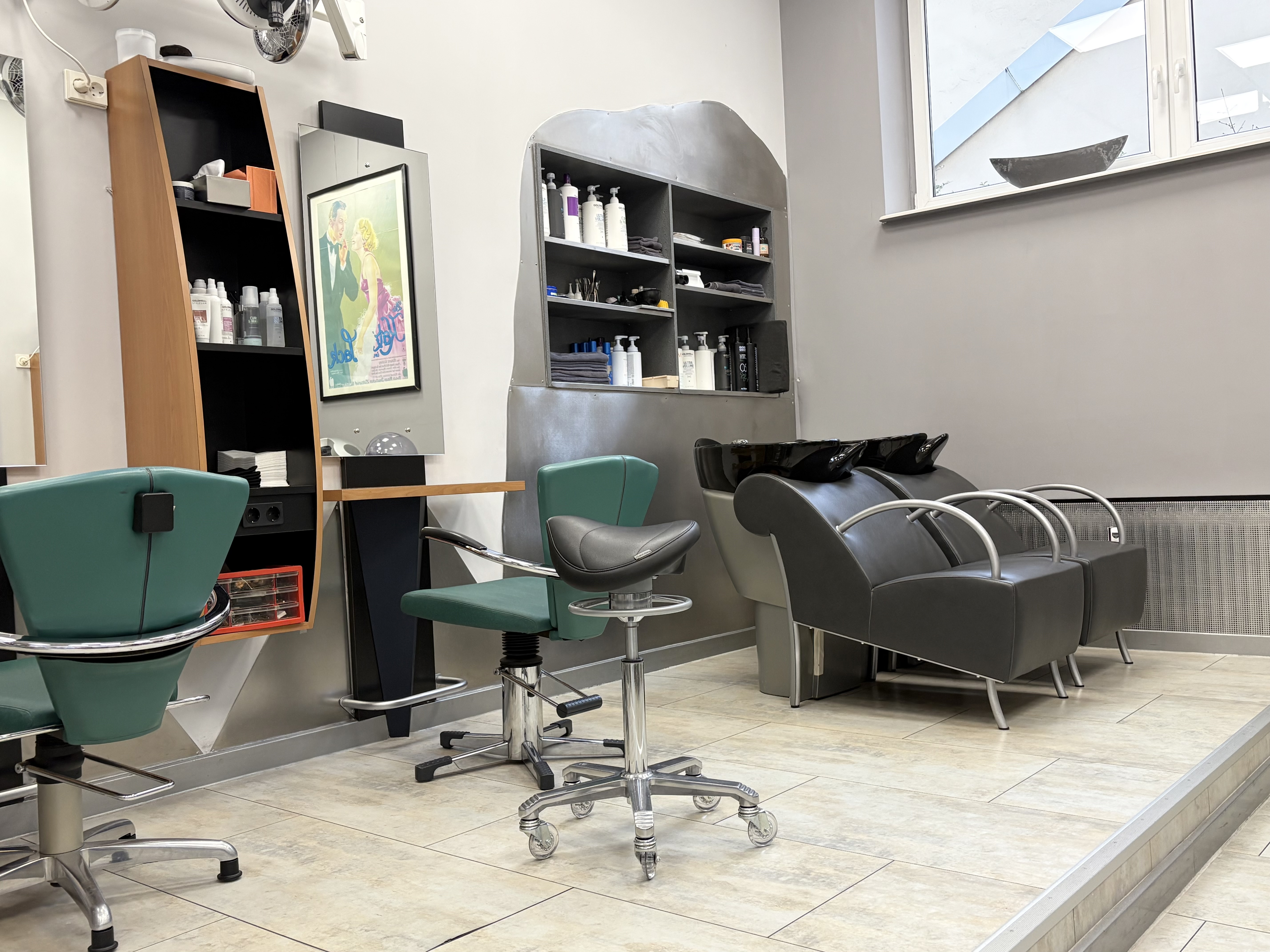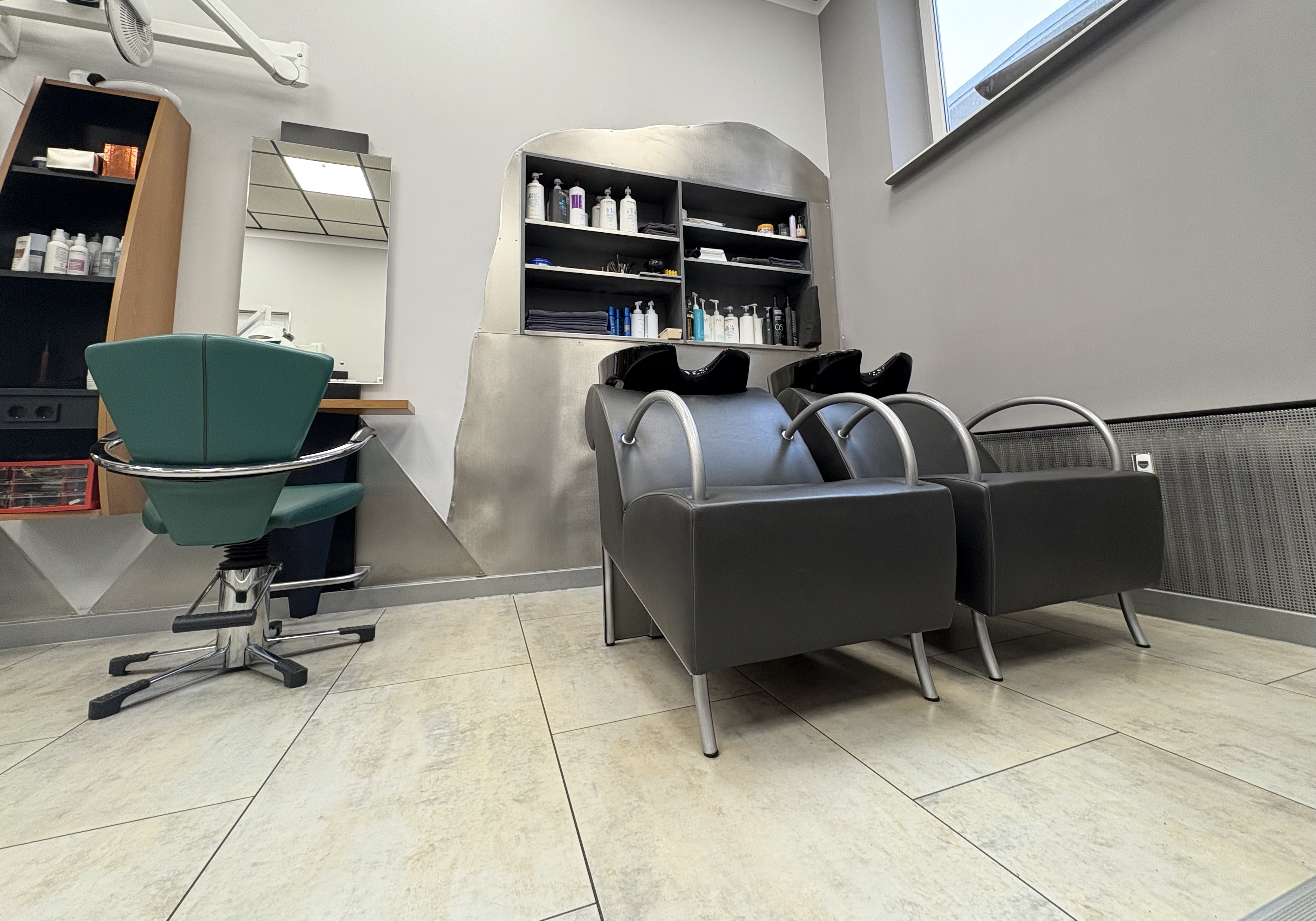 Insgesamt stehen 6 voll ausgestattete Bedienungsplätze zur Verfügung, auf einem Podest sind die bequemen Waschsessel montiert, praktisch ist der dahinterliegende Bereich für die Produkte, dieser Bereich wurde von einem Schlosser auf Maß angefertigt.