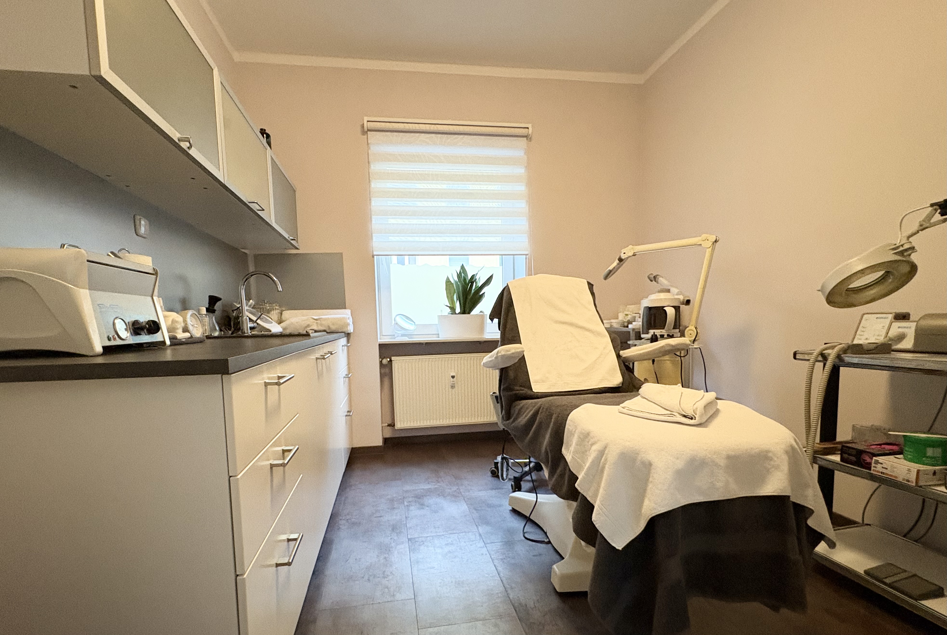 Ein Raum mit kompletter Kosmetikausstattung, ein Labor sowie ein WC ergänzen diesen Bereich.