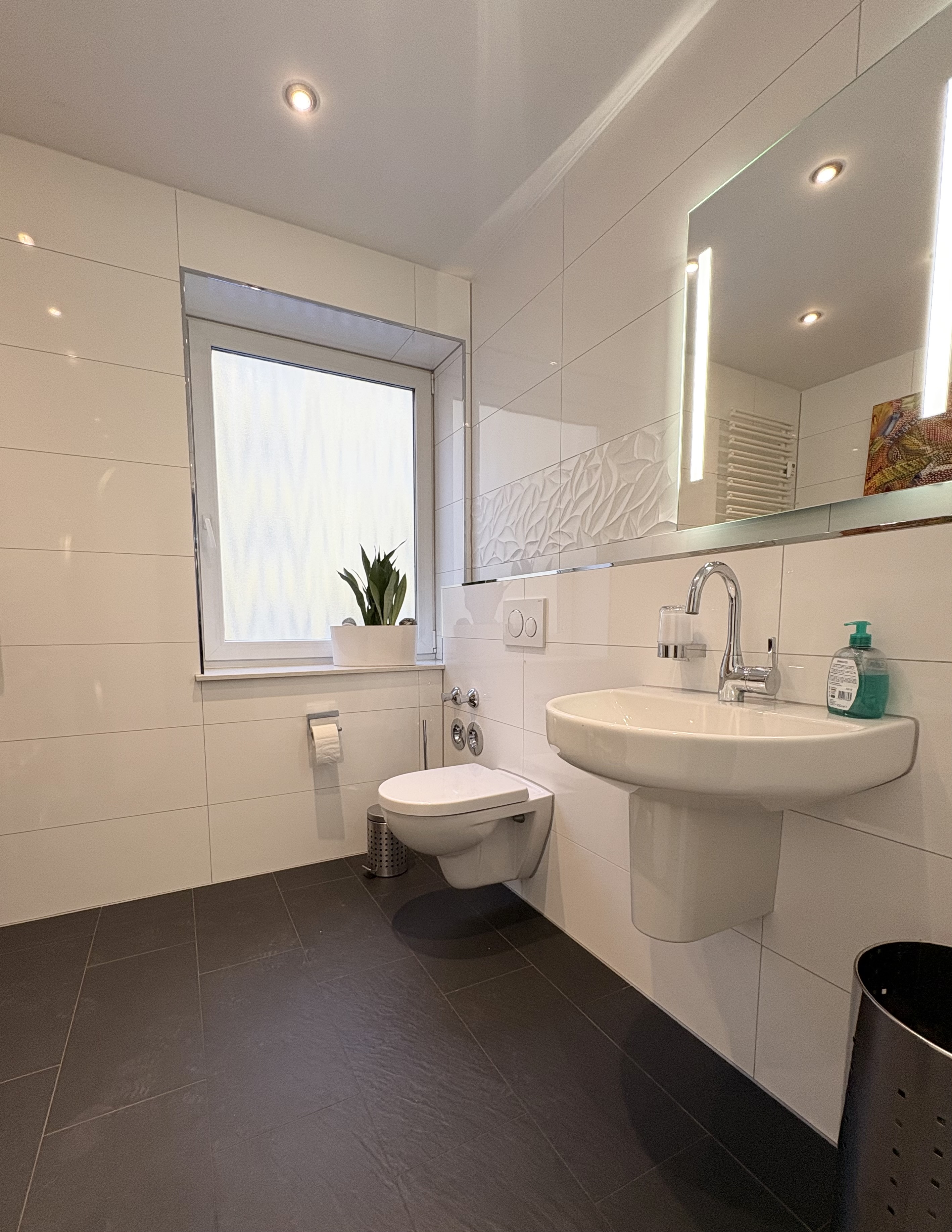Das moderne WC ist mit Waschbecken und beleuchtetem Spiegel ausgestattet, die Anschlüsse für Waschmaschine und Badewanne sind bereits vorgesehen.