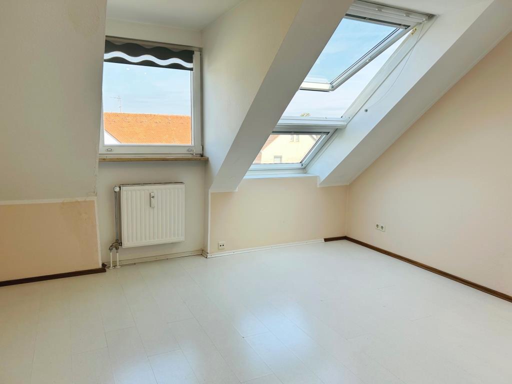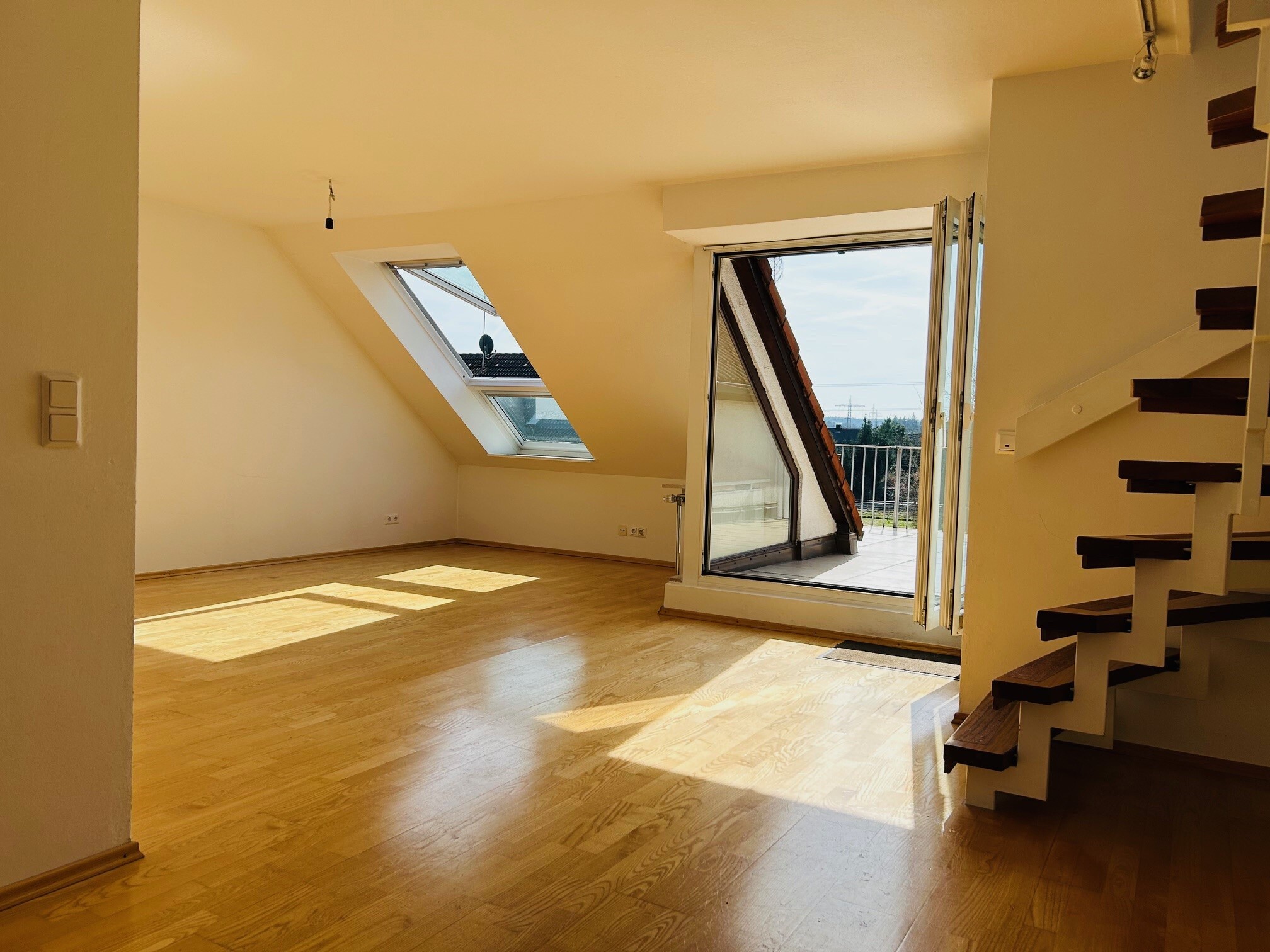 Über eine Holztreppe gelangt man in das ca. 17 m² große Dachstudio, die großen Fenster lassen viel Licht in den Raum.