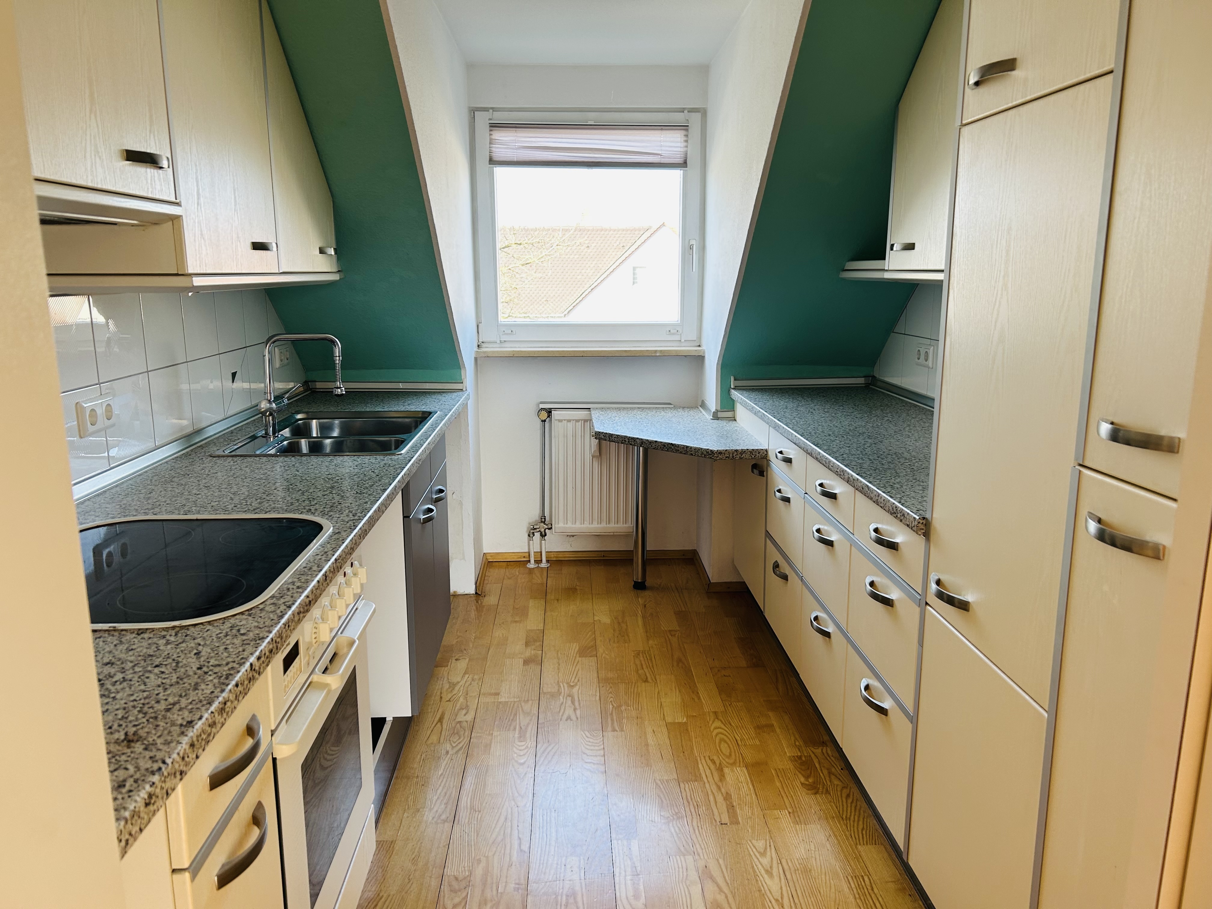Die Einbauküche gehört zur Wohnung und kann kostenfrei übernommen werden, ein Anschluss für Geschirrspüler und Waschmaschine ist installiert, praktisch ist auch die