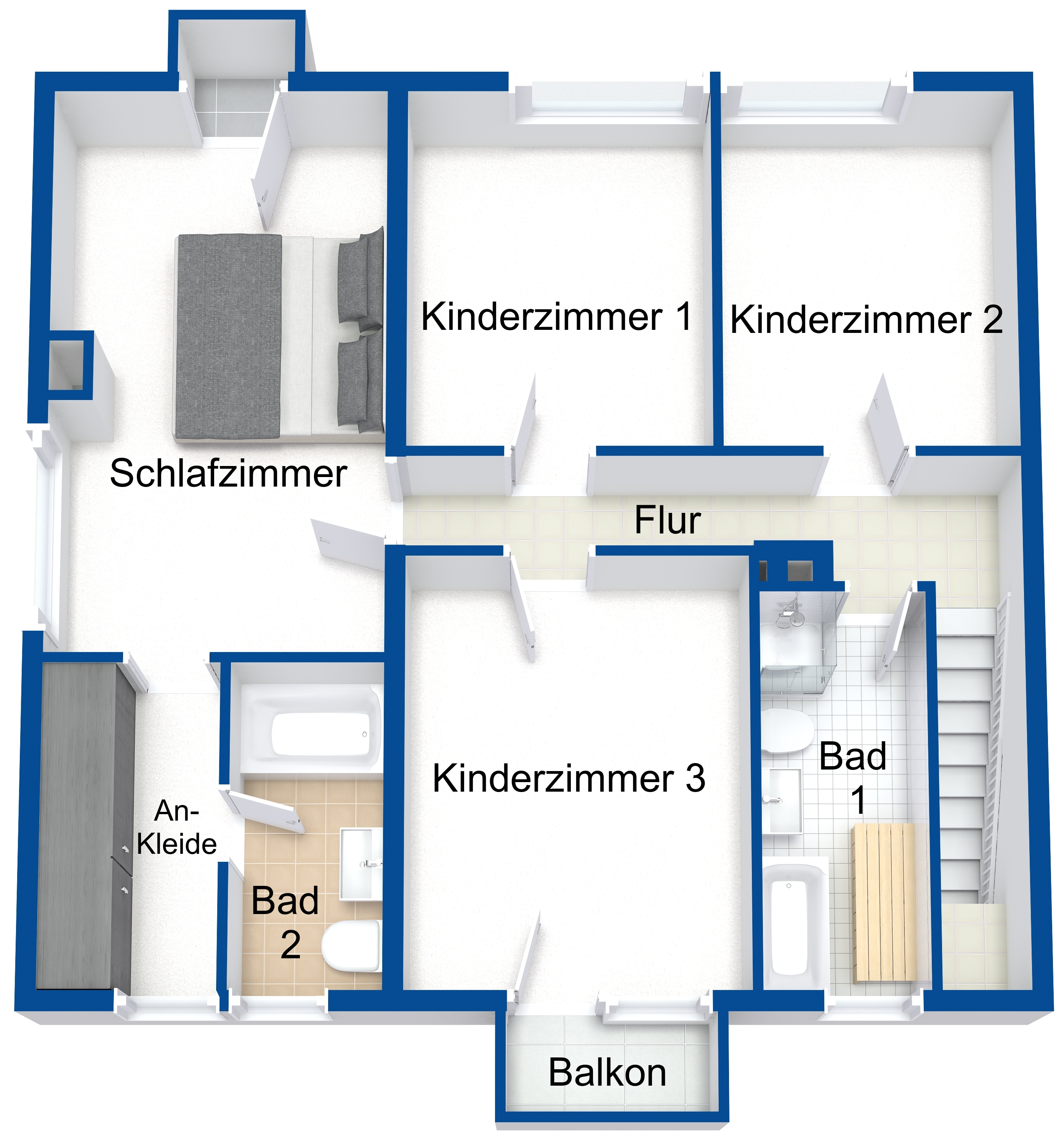 Im Obergeschoss befinden sich 3 Kinderzimmer, ein großes Schlafzimmer mit Ankleide, 2 Bäder und ein Flur.