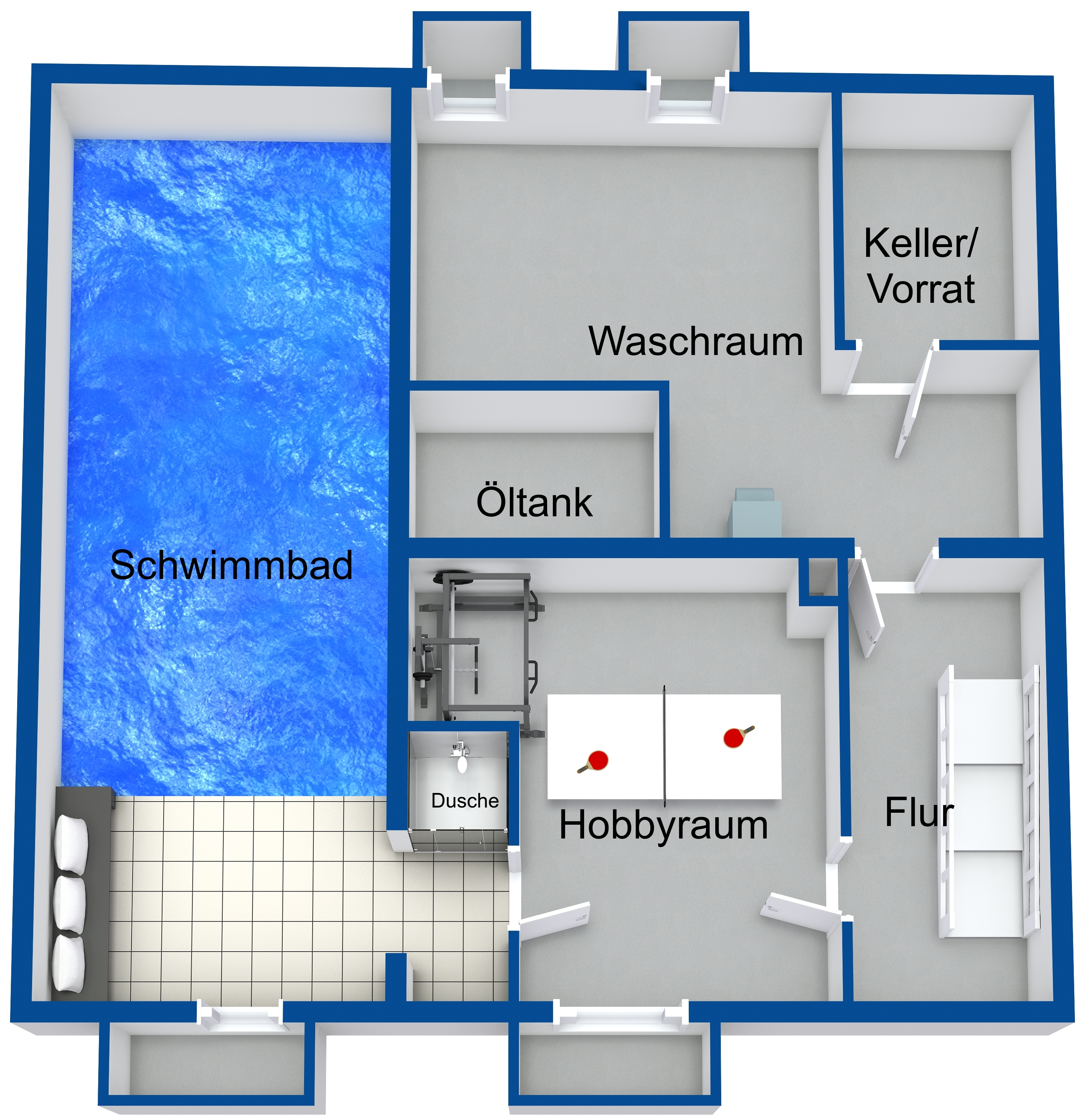 Im Kellergeschoss befinden sich ein Schwimmbad, eine Dusche, ein Hobbyraum, ein Heiz-und Waschraum, ein Vorratsraum und ein Vorraum.