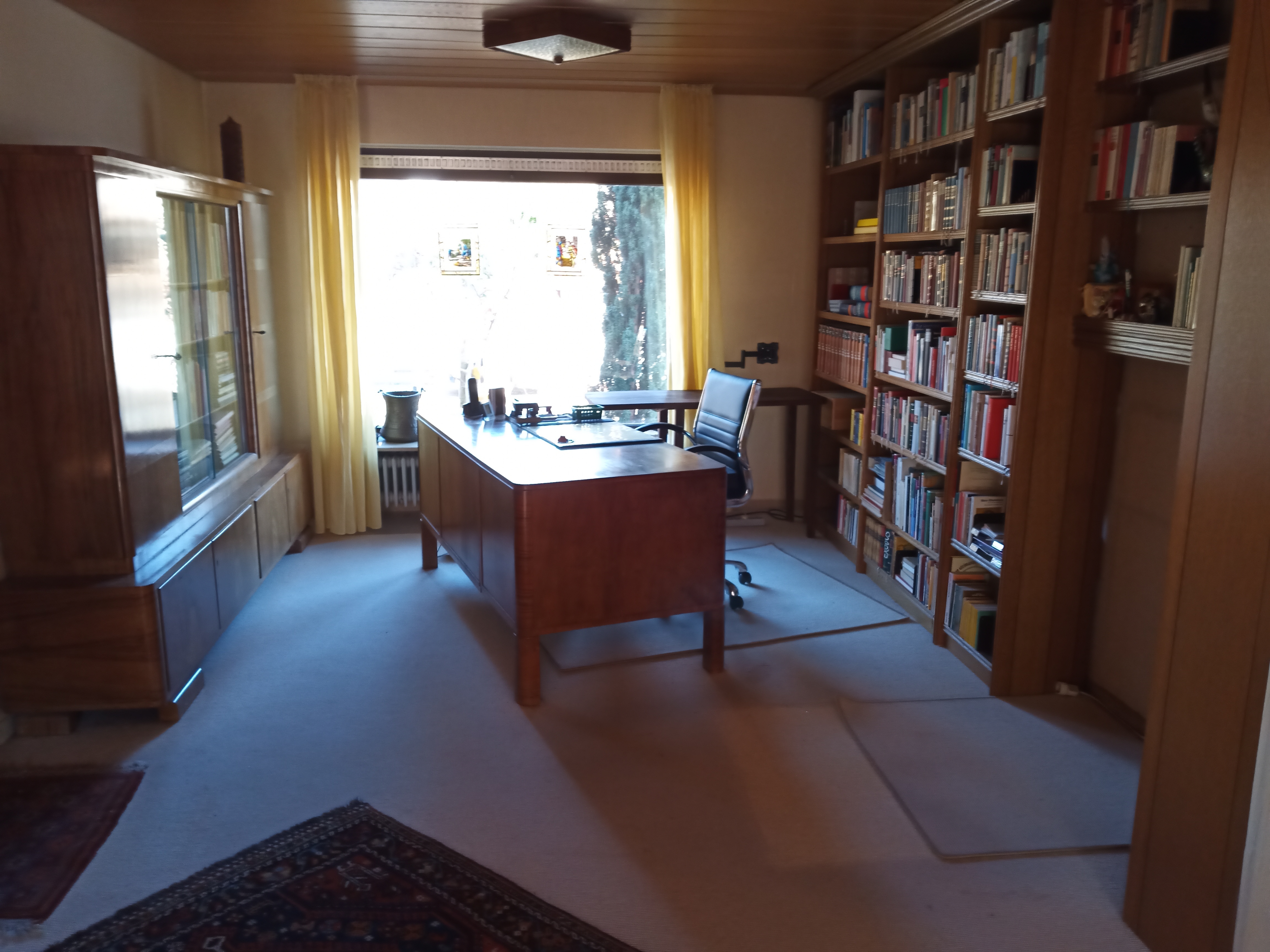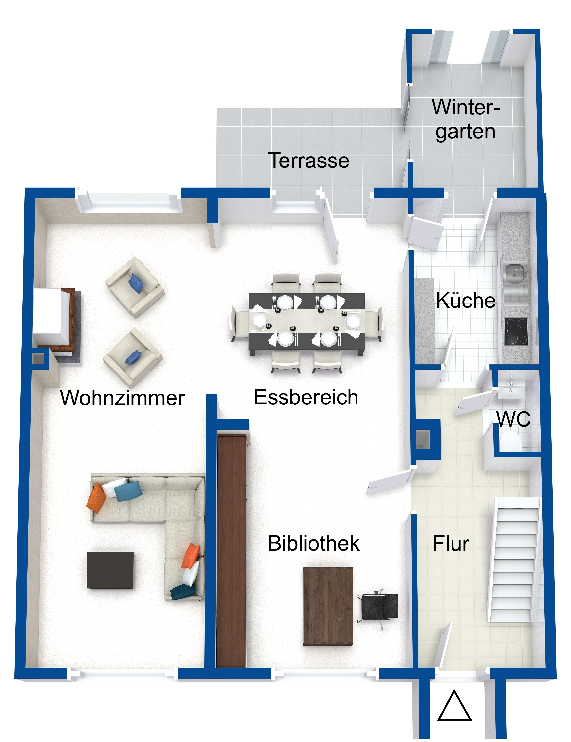 Im Erdgeschoss befinden sich ein großes Wohnzimmer mit Essbereich und Bibliothek, eine Küche, ein Gäste-WC und eine Diele. Vom Essbereich aus gelangt man auf die Südwest-Terrasse und von der Küche aus kommt man in den Wintergarten mit Zugang zum schönen Garten.