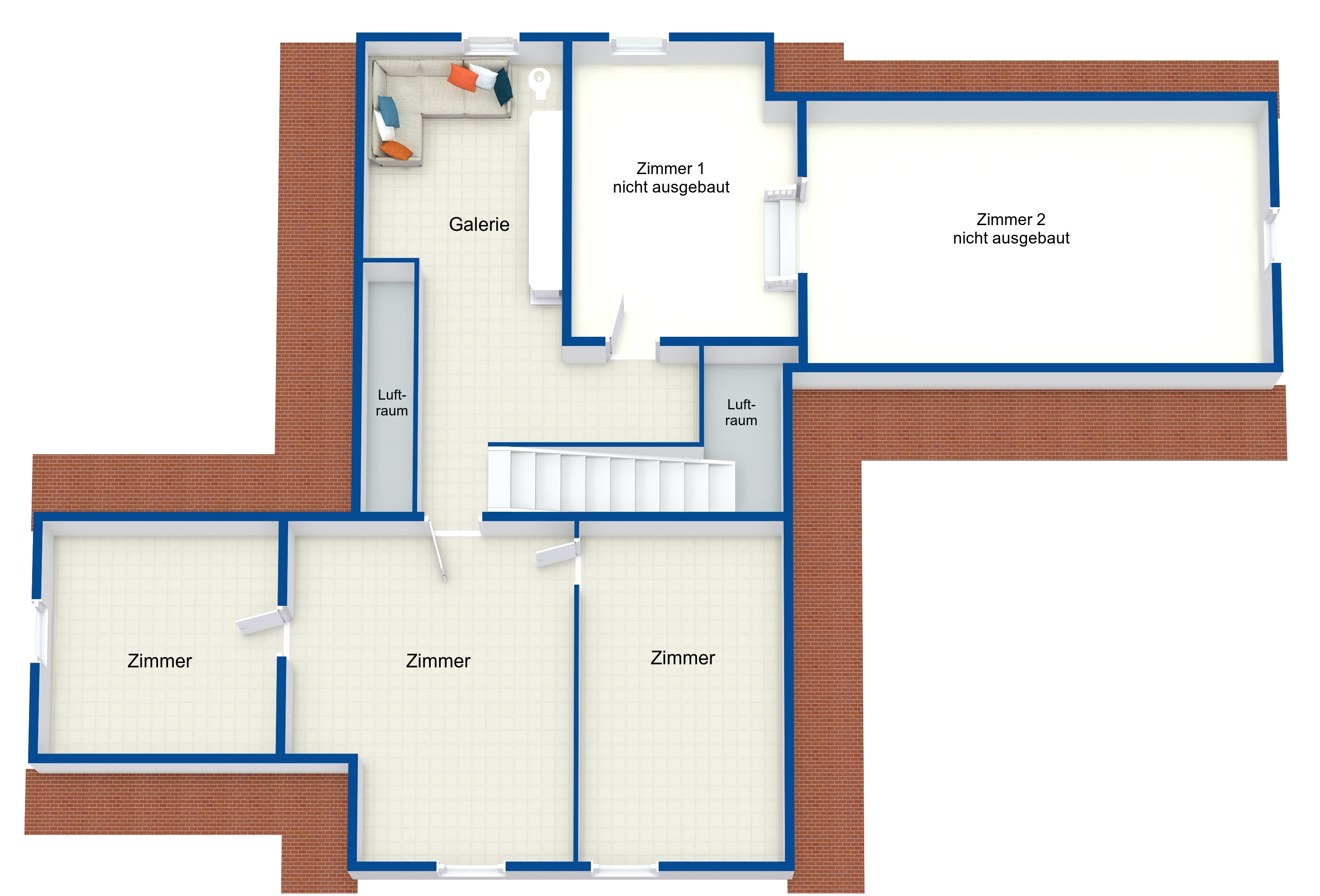 Im Dachgeschoss befinden sich insgesamt 5 Zimmer ( davon sind 2 Zimmer nicht ausgebaut ) und eine großzügige Galerie.