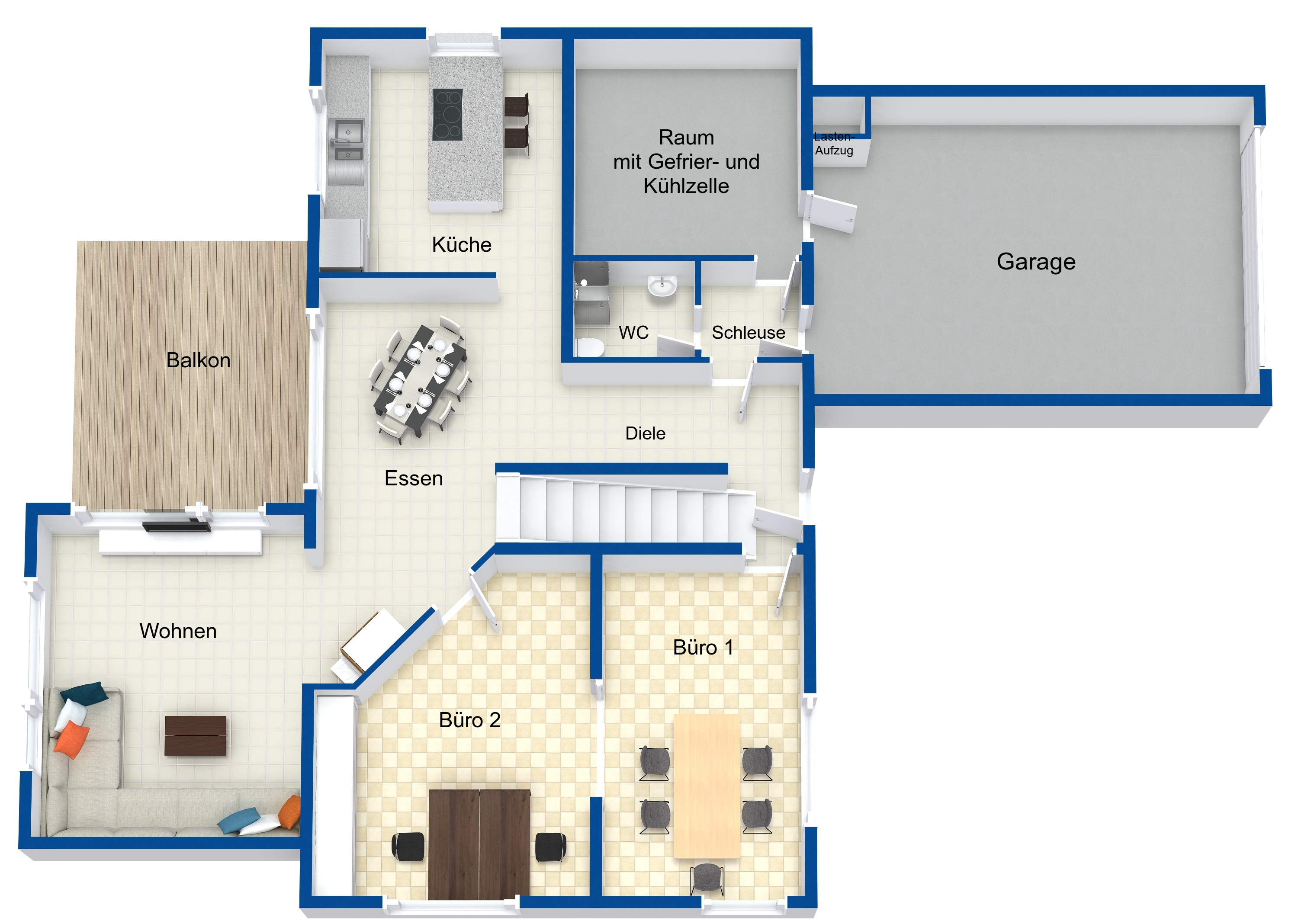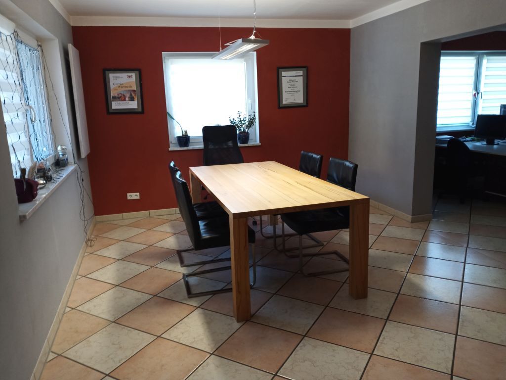 Im Erdgeschoss befinden sich ein Wohnzimmer mit großem Essbereich, eine große Küche, 2 Büroräume, ein Bad mit Dusche, ein Raum mit Gefrier-u. Kühlzelle und eine kleine Schleuse mit direktem Zugang zur großen Doppelgarage. Vom Essbereich aus gelangen Sie auf einem großen Balkon mit schöner Aussicht.