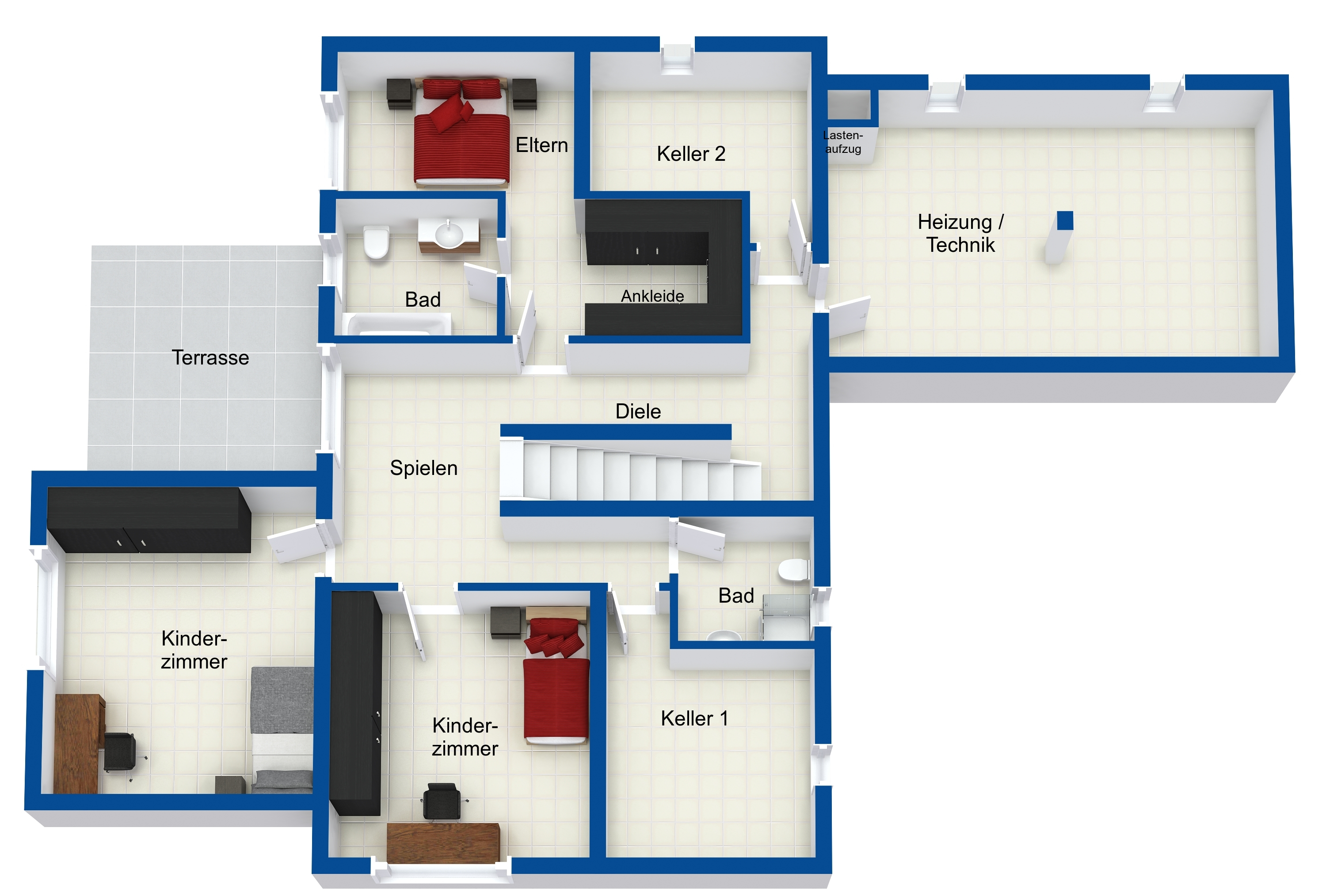 Im Untergeschoss befinden sich eine großzügige Diele, 2 große Kinderzimmer, ein Schlafzimmer, ein Ankleidezimmer, 2 Bäder, 2 Kellerräume und ein Heizungsraum. Von der Diele aus gelangen Sie auf die Terrasse mit Zugang zum sehr großen Garten.