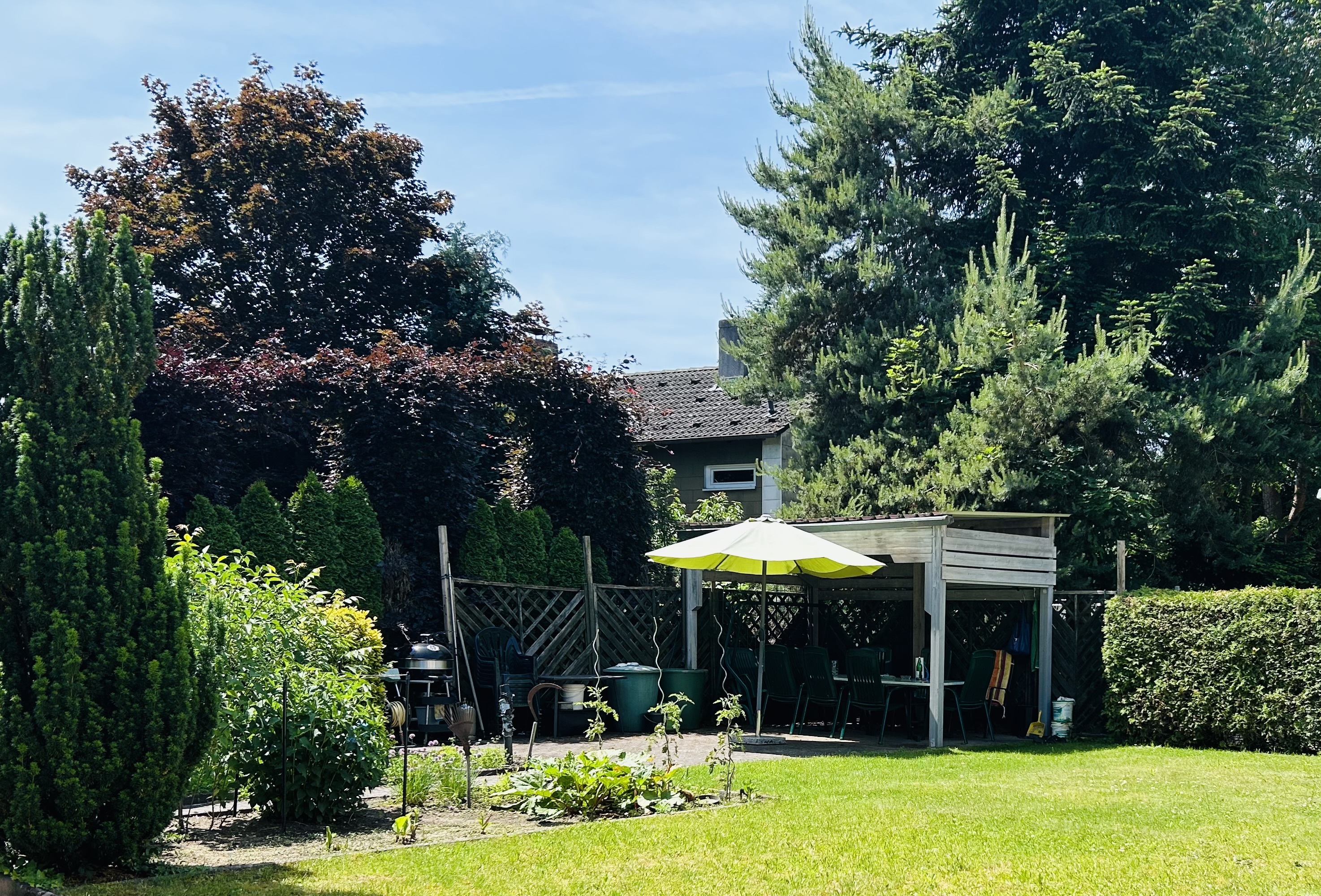 Der gepflegte Gartenbereich mit überdachten Freisitz bietet Platz zum Entspannen.