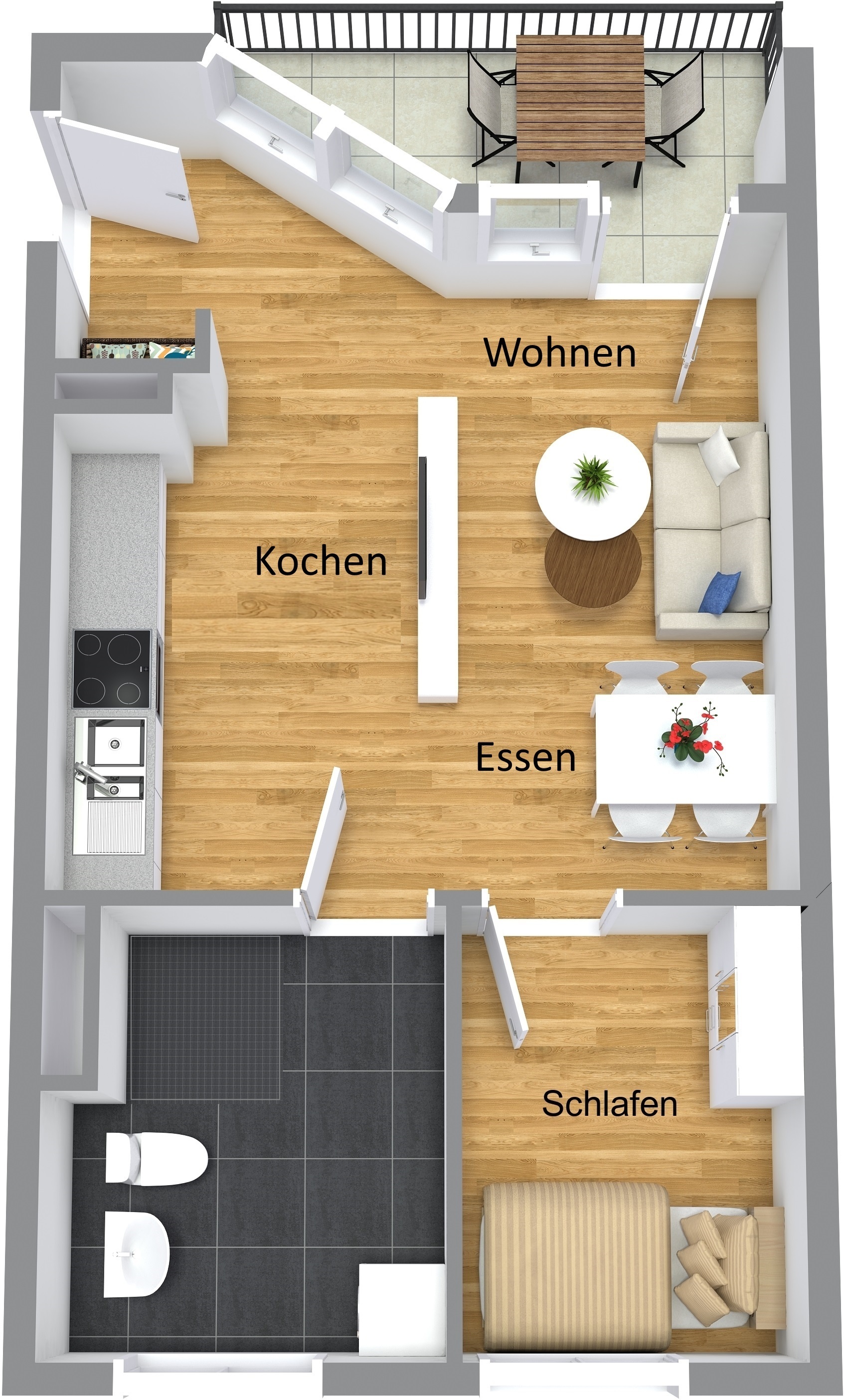Die Wohnung hat eine Wohnfläche von ca. 44,30 m². Auch ein geräumiger Kellerraum gehört zur Wohnung.
