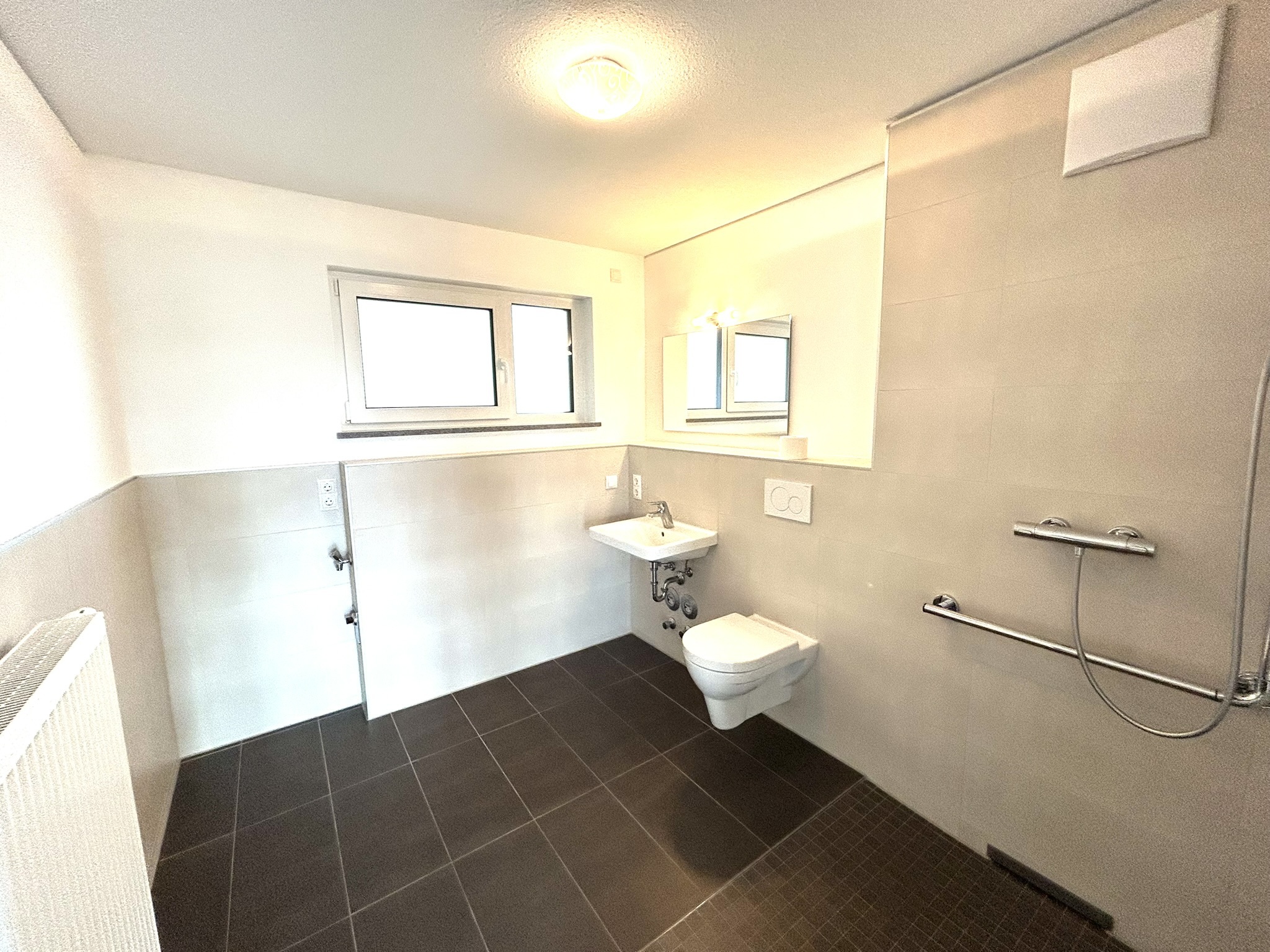 Von dort geht es in das barrierefreie Tageslichtbad mit rollstuhlgerechter Dusche.