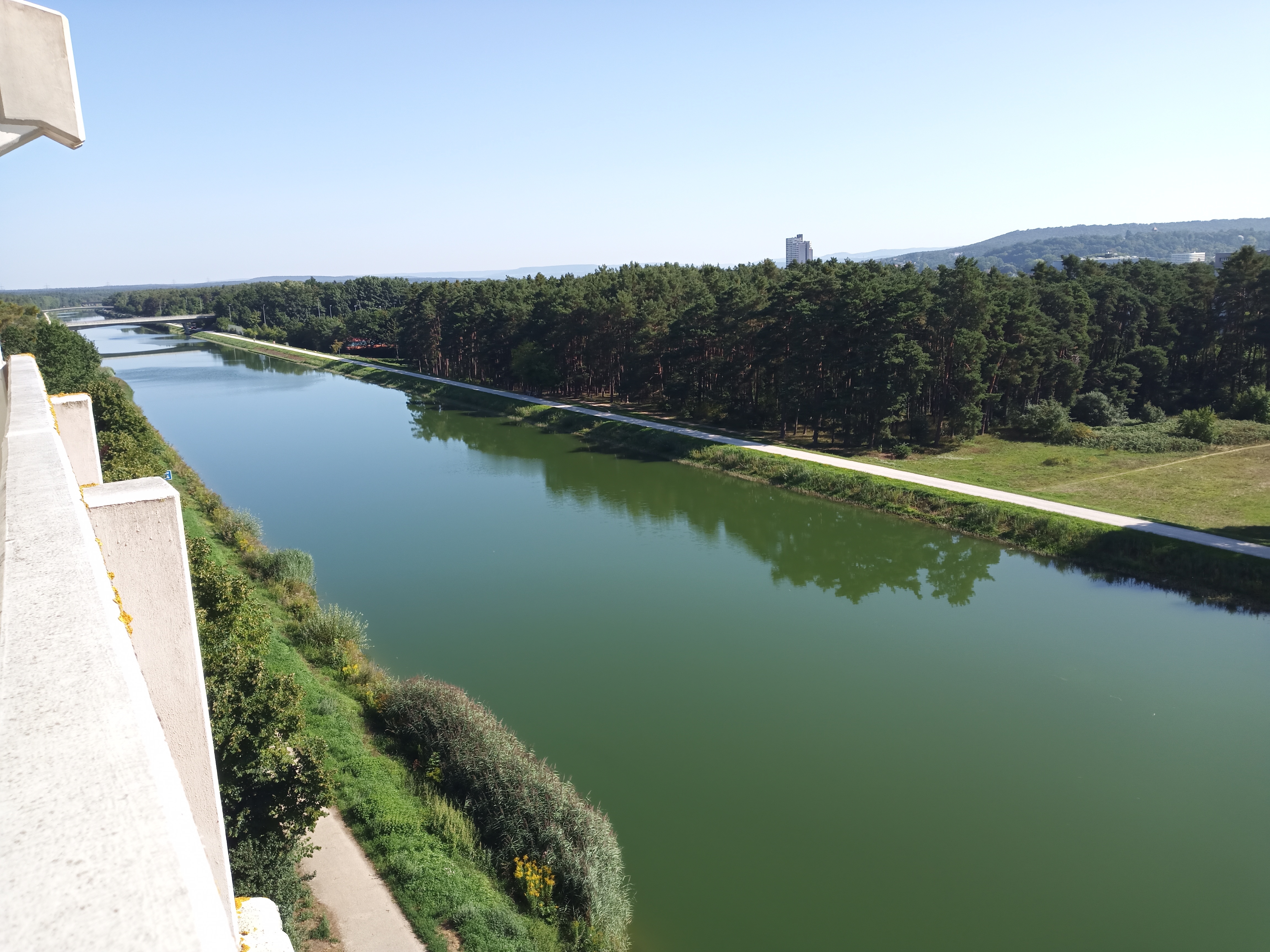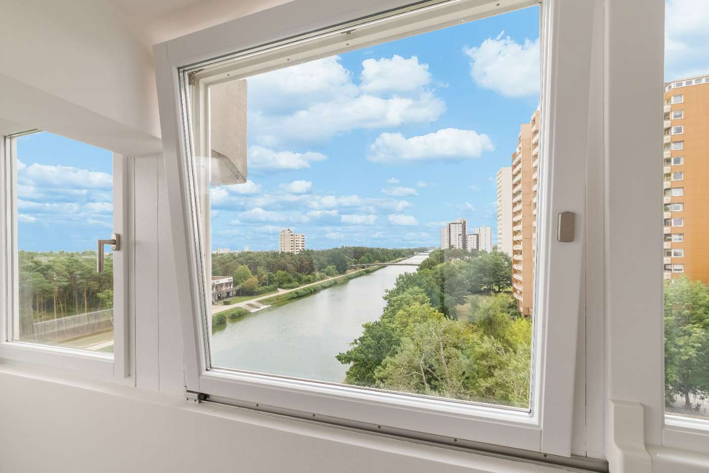 Vom sehr großzügigen Wohnzimmer aus gelangt man in den Süd-Wintergarten und auf 2 Balkone mit einer sehr schönen Aussicht über den Kanal.