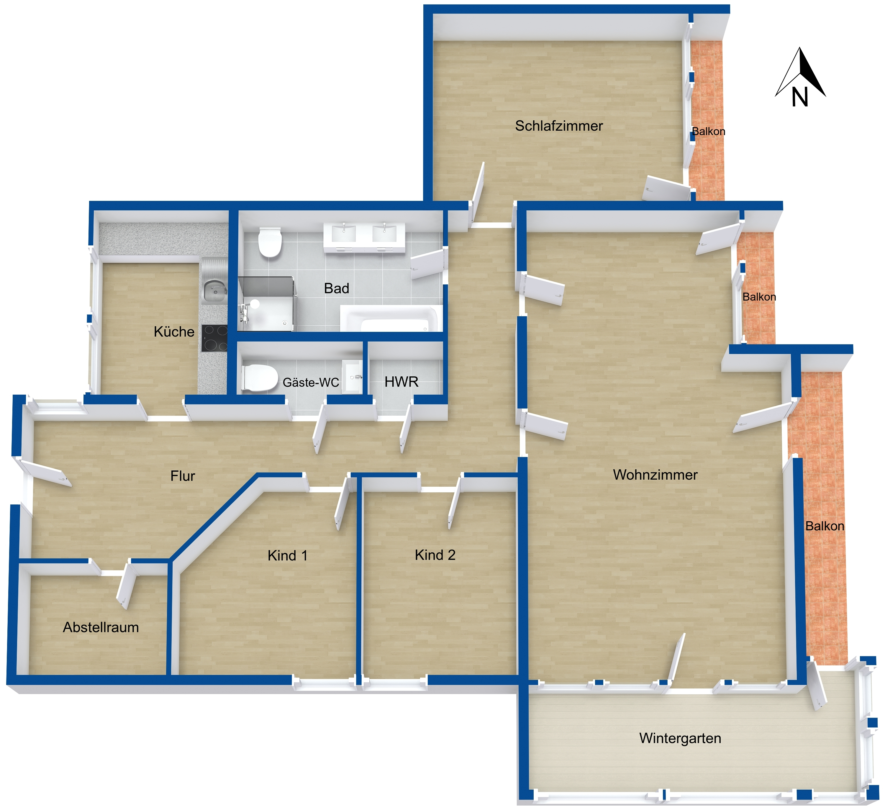 Von der großzügigen Diele und Flur aus gelangen Sie in alle 4 Zimmer, in die Küche, in das Gäste-WC in den Hauswirtschaftsraum, in den großzügigen Abstellraum und in das hochwertige Bad.