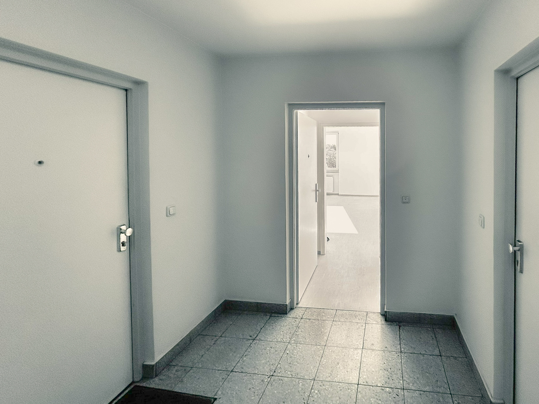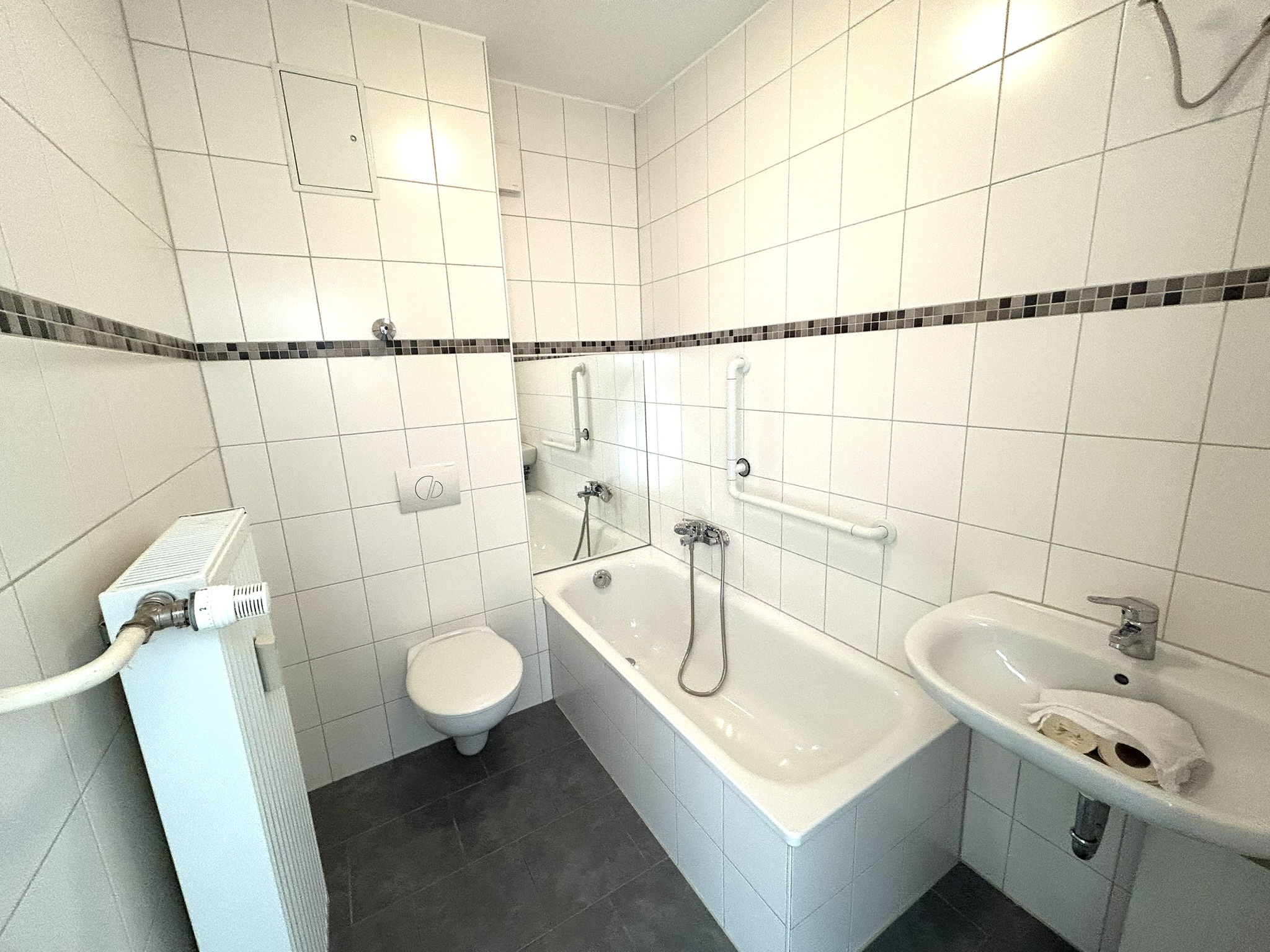 Beim Betreten der Wohnung gelangen Sie in den praktischen Dielenbereich, der mit einem großzügigen Einbauschrank ausgestattet ist – ideal als Garderobe oder zusätzlicher Stauraum. Direkt von der Diele aus erreichen Sie das modern gestaltete Badezimmer, das mit hochwertigen Fliesen, einem WC, Waschbecken und einer Badewanne ausgestattet ist.