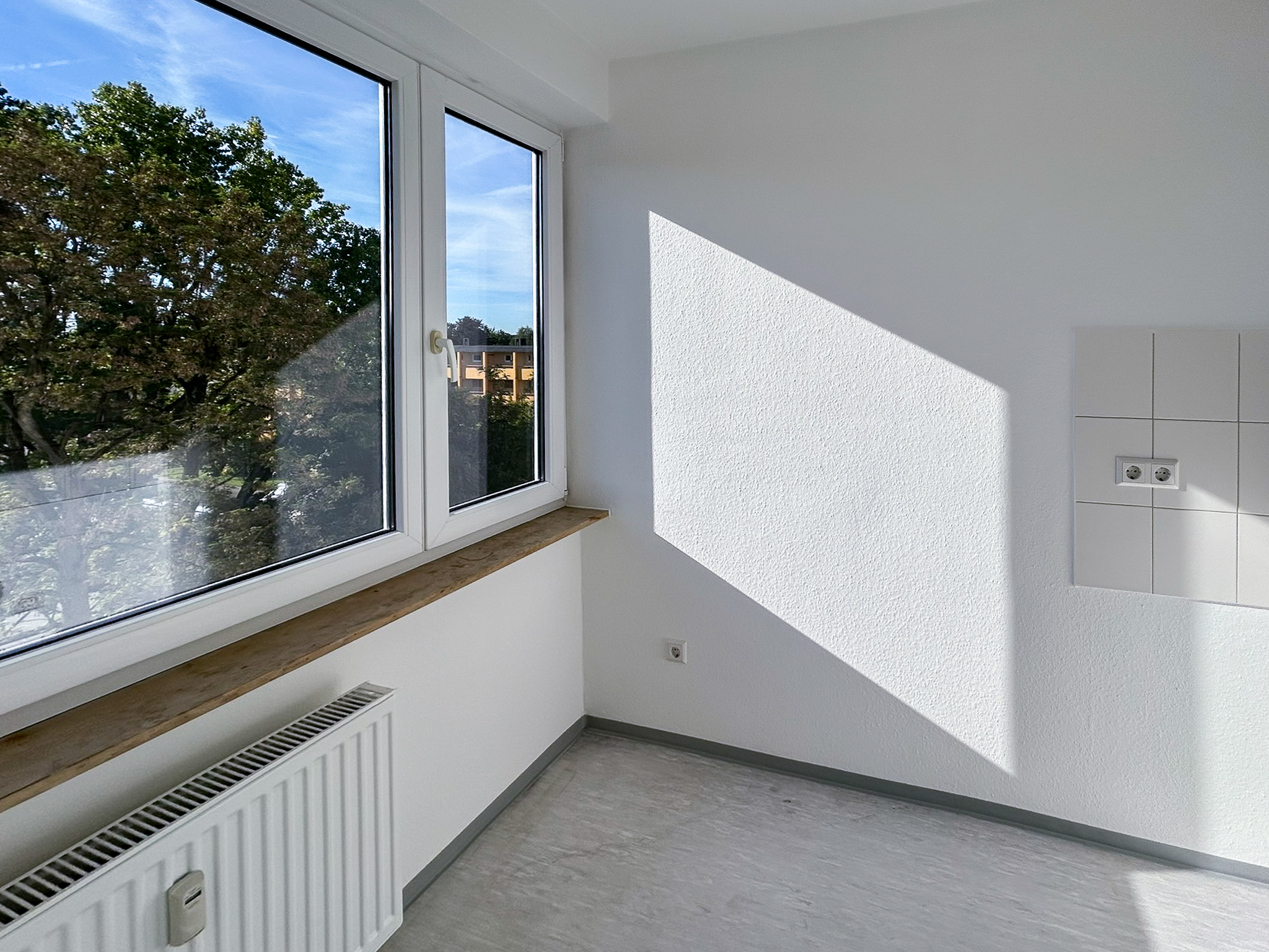 Vom Wohnbereich aus betreten Sie die kompakte, aber sehr zweckmäßige Küche mit Fenster. Die Küche ist vom Wohnraum optisch abgetrennt und bietet trotz der geringen Größe alles, was für den Alltag notwendig ist – ideal für Singles oder Pendler.