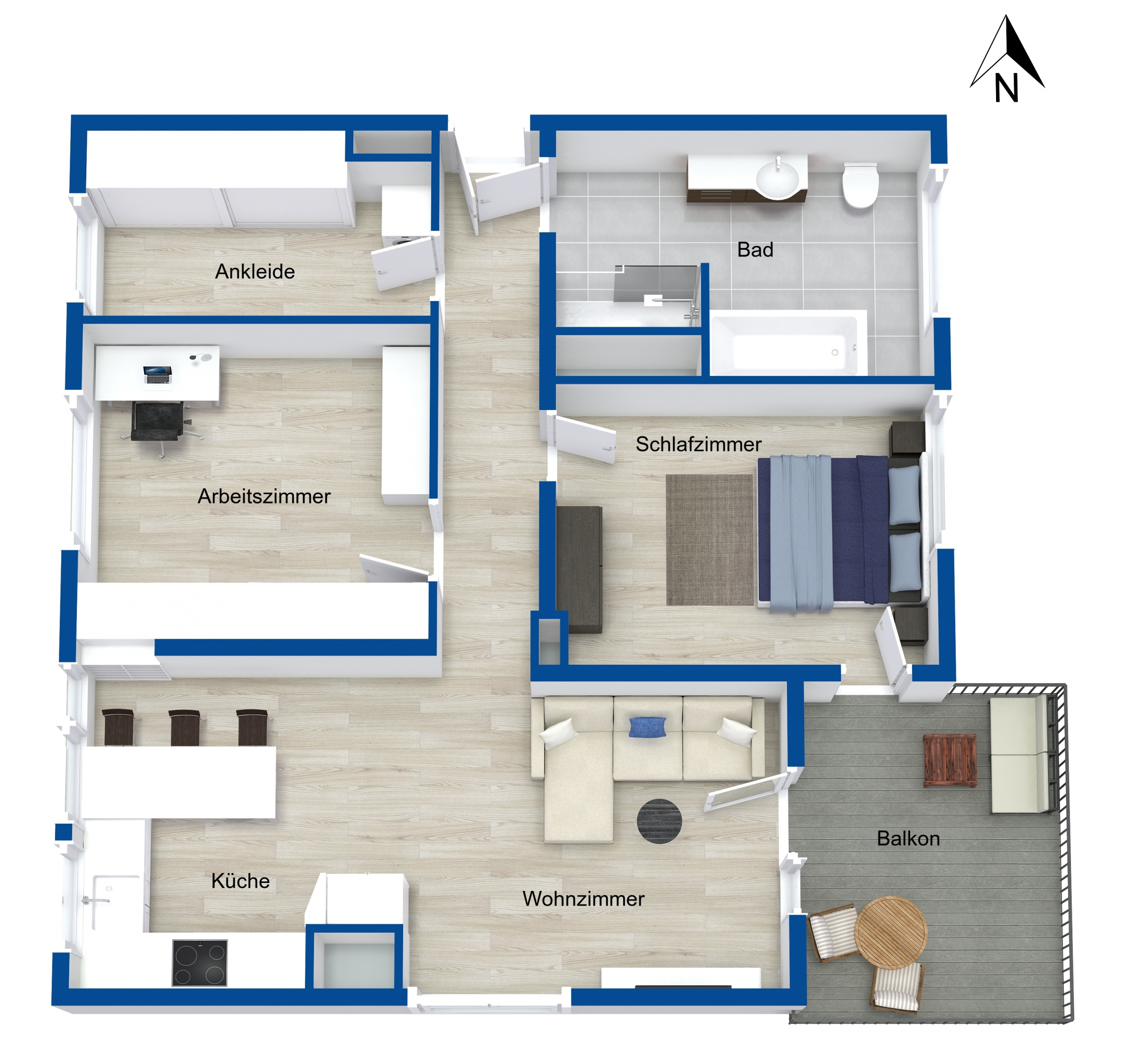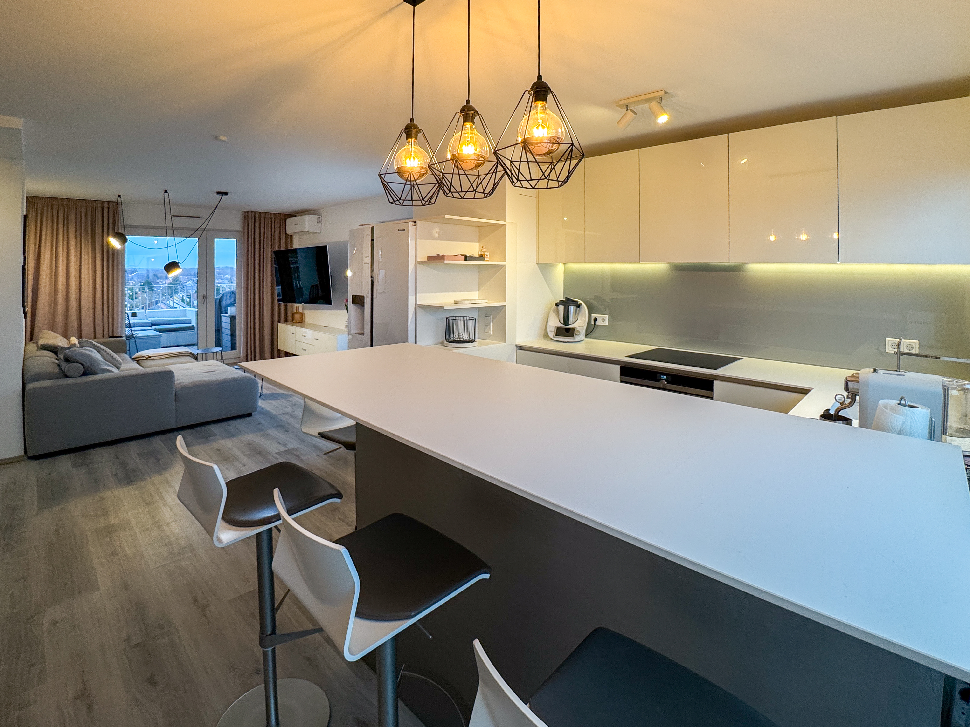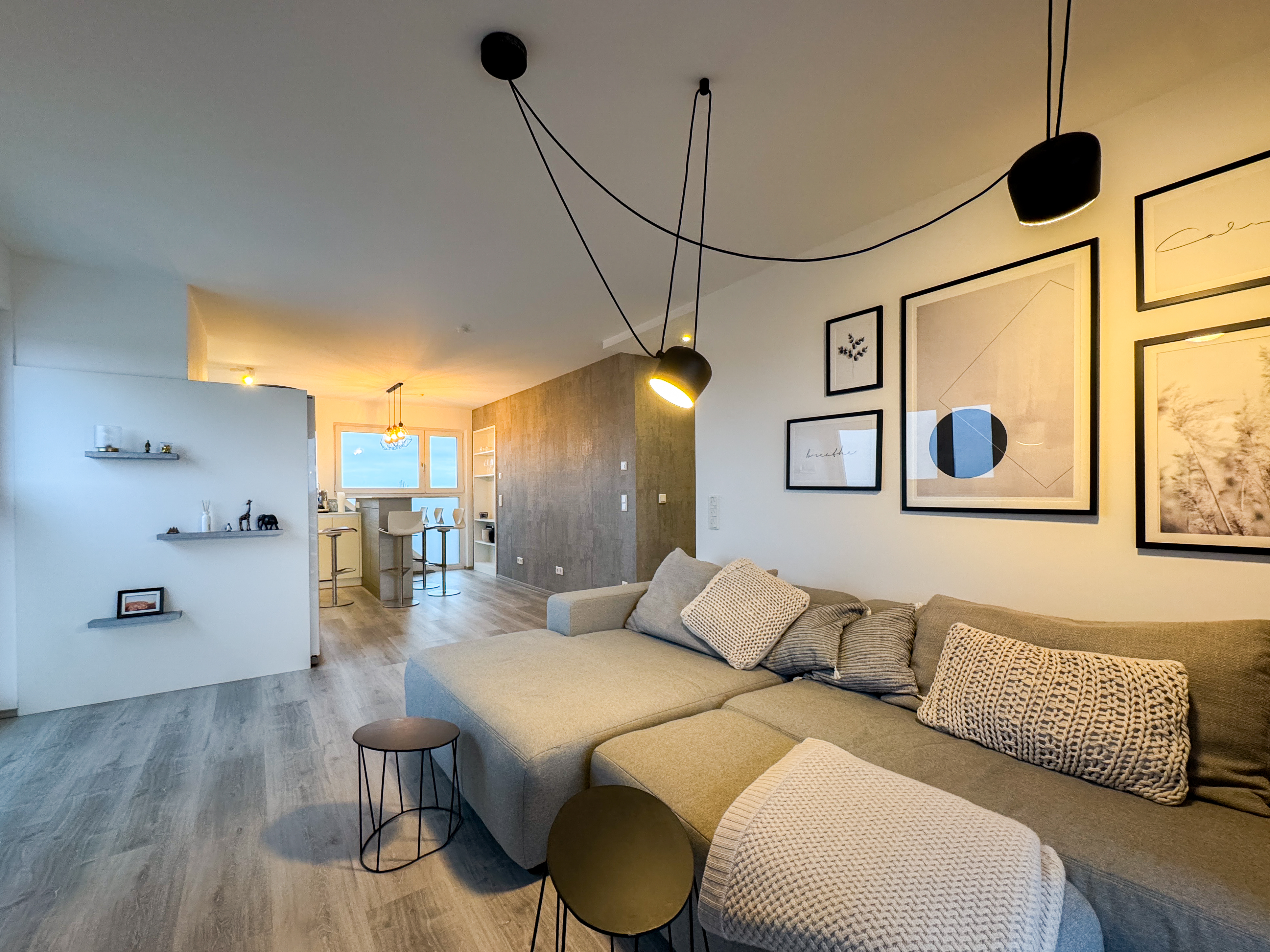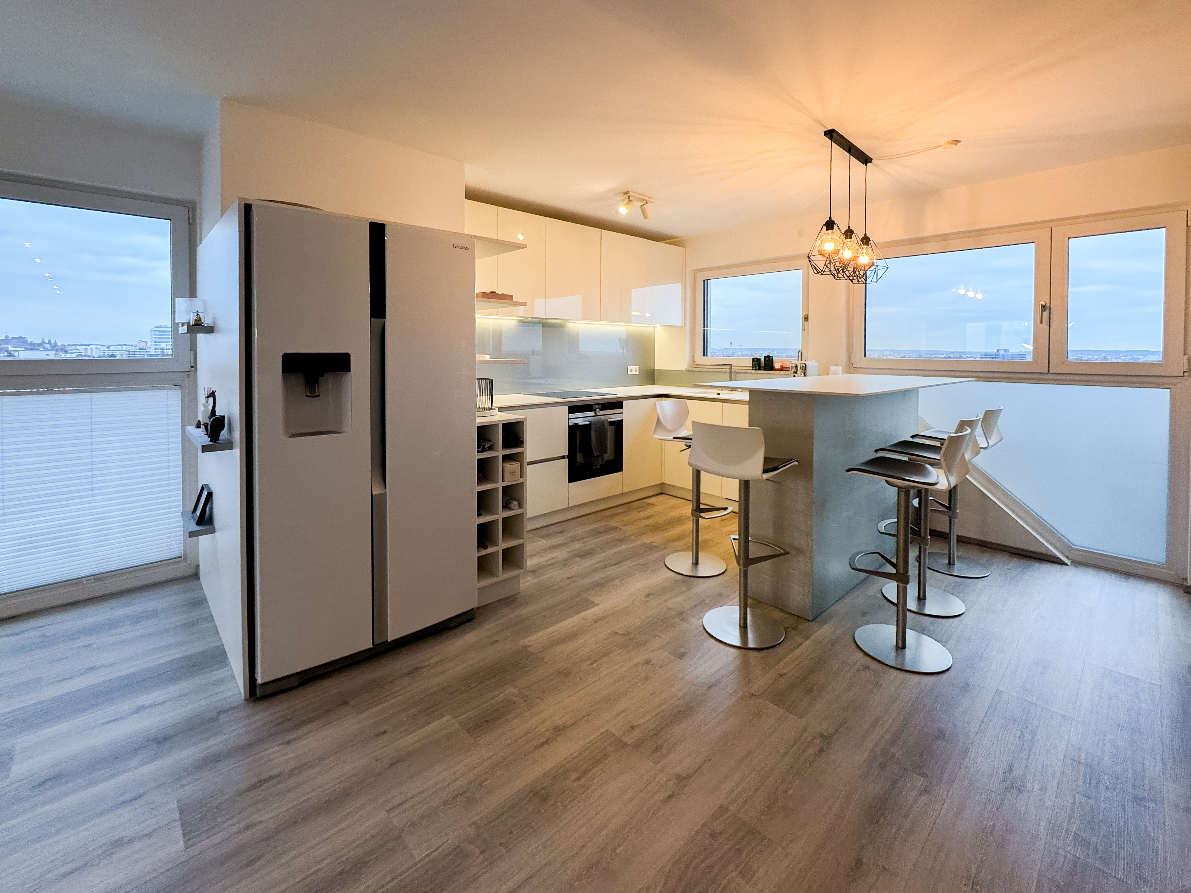 Der großzügige Wohn- und Essbereich mit offen gestalteter Küche bildet das Herzstück der Wohnung. Durch die fast bodentiefen Fensterfronten ist der gesamte Raum lichtdurchflutet und eröffnet einen spektakulären, weitreichenden Blick über die Dächer ganz Nürnbergs, ein Wohngefühl, das jeden Tag aufs Neue begeistert. Der über 10 m² große Balkon erweitert den Wohnraum nach draußen und lädt zum Entspannen, Genießen und Verweilen ein. Hier lassen sich Sommerabende ebenso ideal verbringen wie ruhige Momente mit einem Kaffee am Morgen.