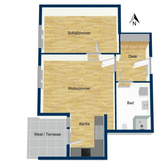 Die gepflegte Wohnung ist gut geschnitten. Von der Diele aus gelangen Sie in das Wohnzimmer mit offener Küche, und in das Bad. Vom Wohnzimmer aus kommen Sie in das Schlafzimmer und auf die größtenteils überdachte West-Terrasse. In der Küche befindet sich eine Einbauküche mit Elektrogeräten. Das Wohnzimmer, Schlafzimmer und die Diele sind mit einem Echtholzparkett ausgelegt. Die Küche ist mit Fliesen ausgelegt. Alle Fenster sind mit elektrischen Rollläden ausgestattet. Das Bad ist seniorengerecht ausgestattet.