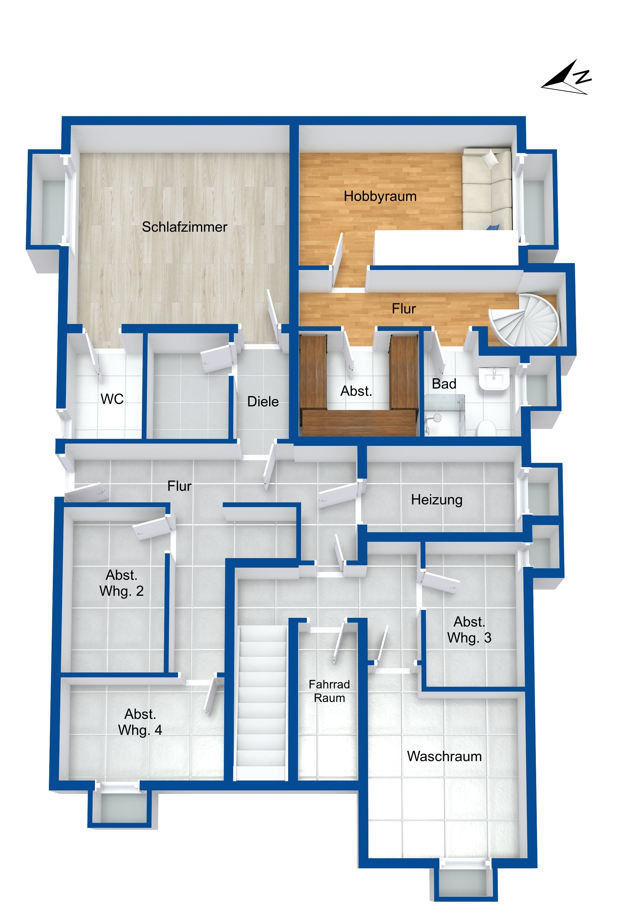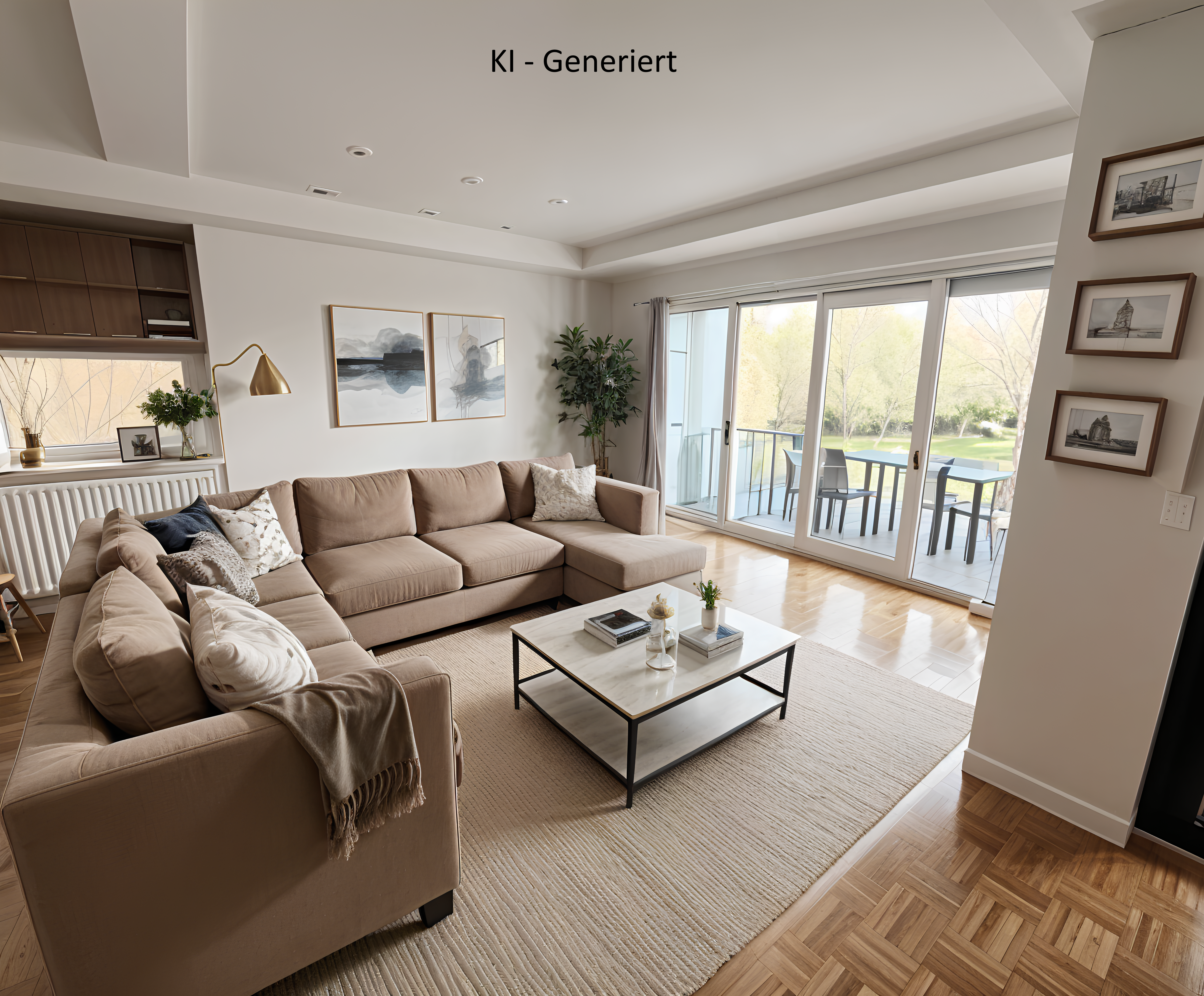 Die Immobilie präsentiert sich in einem gepflegten Zustand. Die Böden sind mit einer Kombination aus Parkett, Laminat und Fliesen gestaltet, was für eine praktische und zeitlose Optik sorgt.