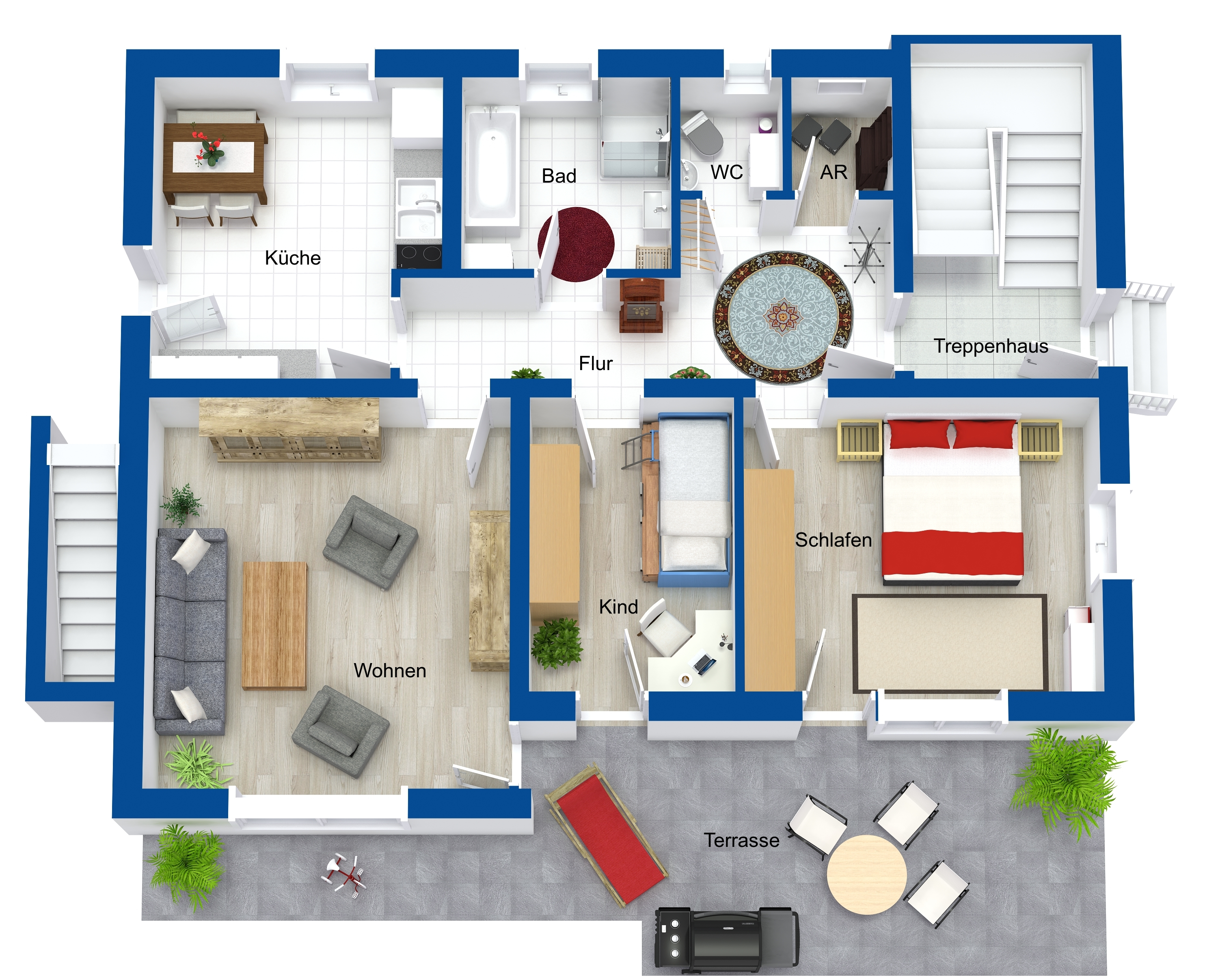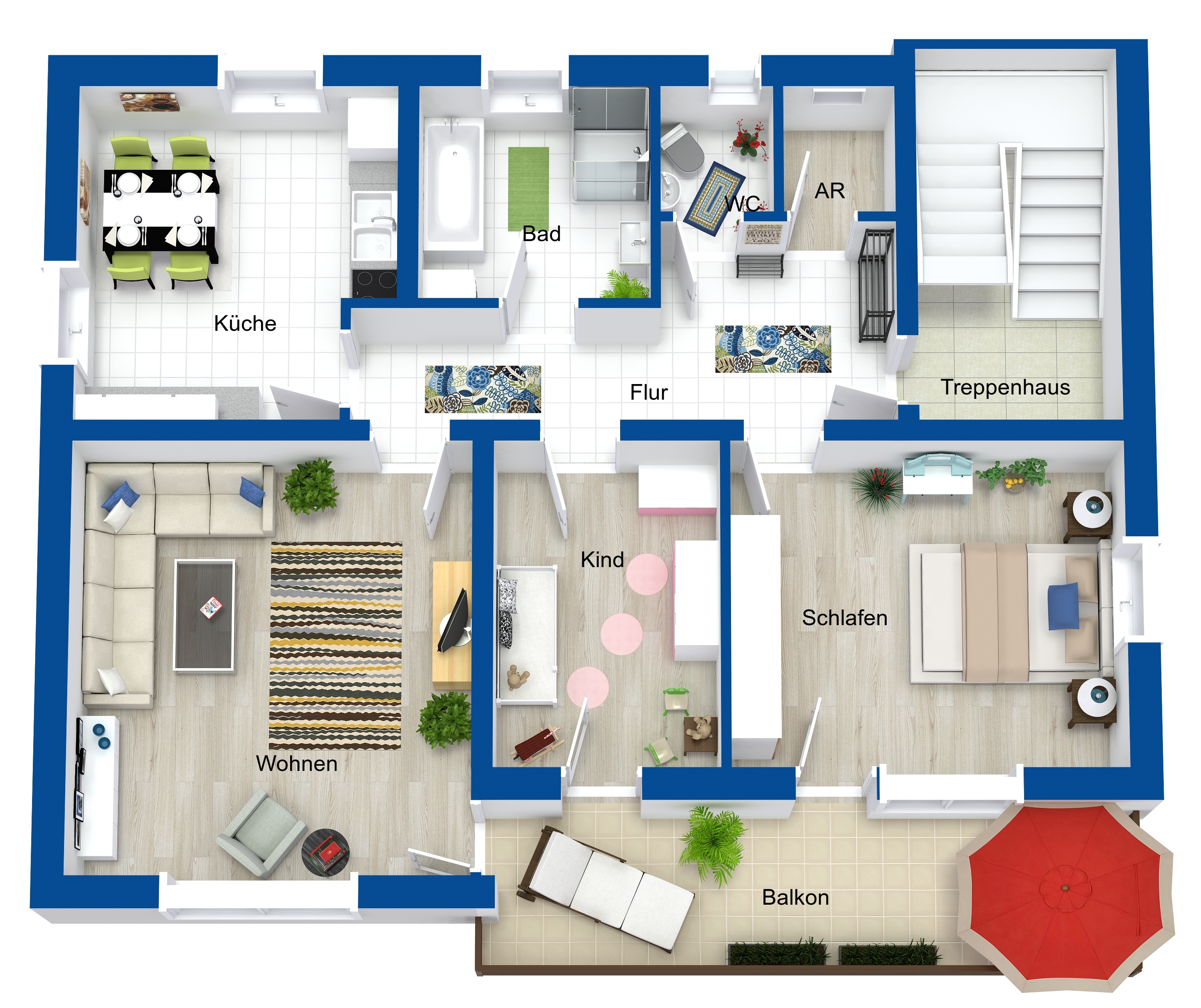- Bodenbelag: Laminat, Teppichboden, Fliesen