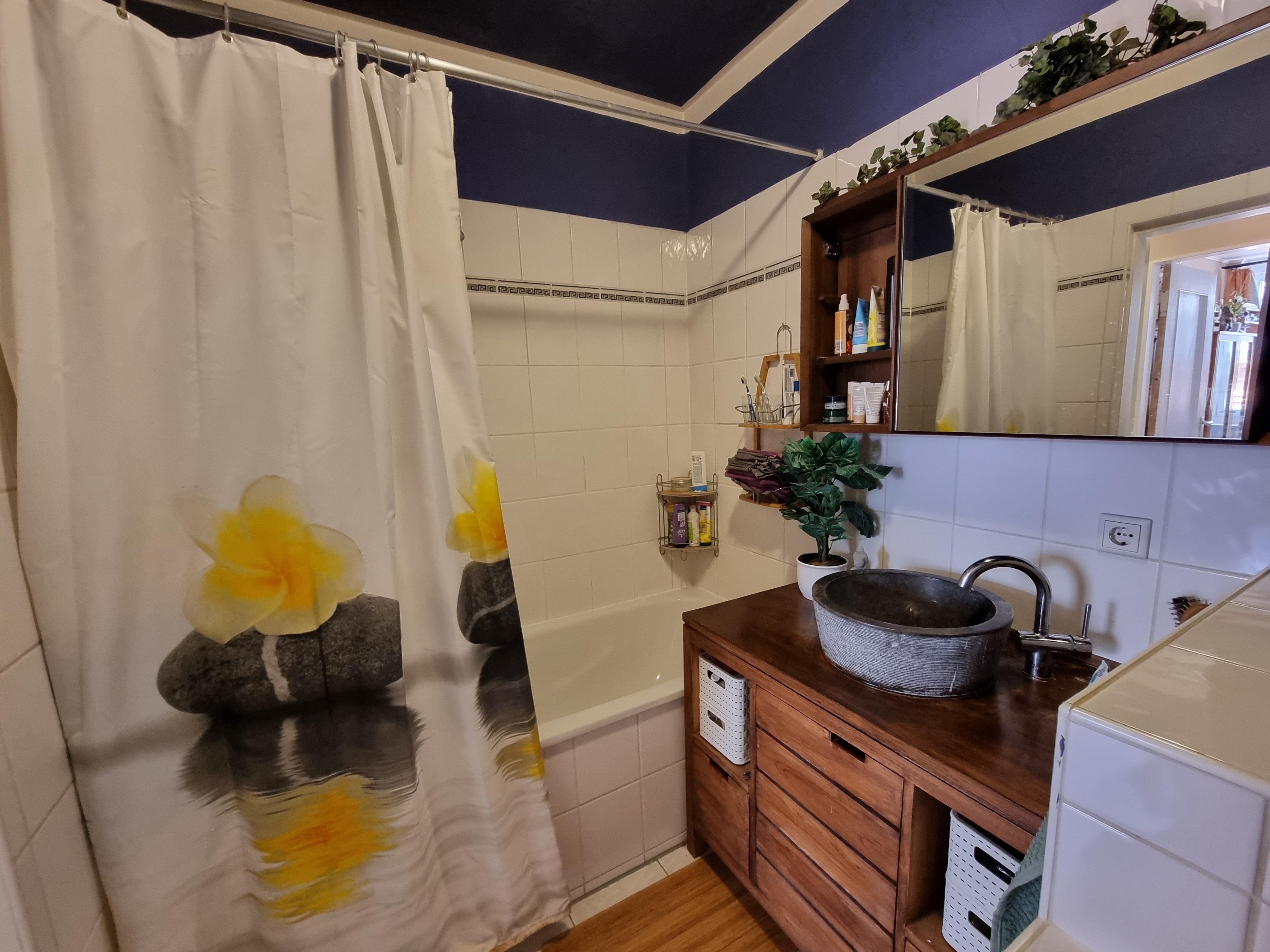 Das Badezimmer ist innenliegend und verfügt über eine Duschbadewanne, sowie ein WC und ein Waschbecken.