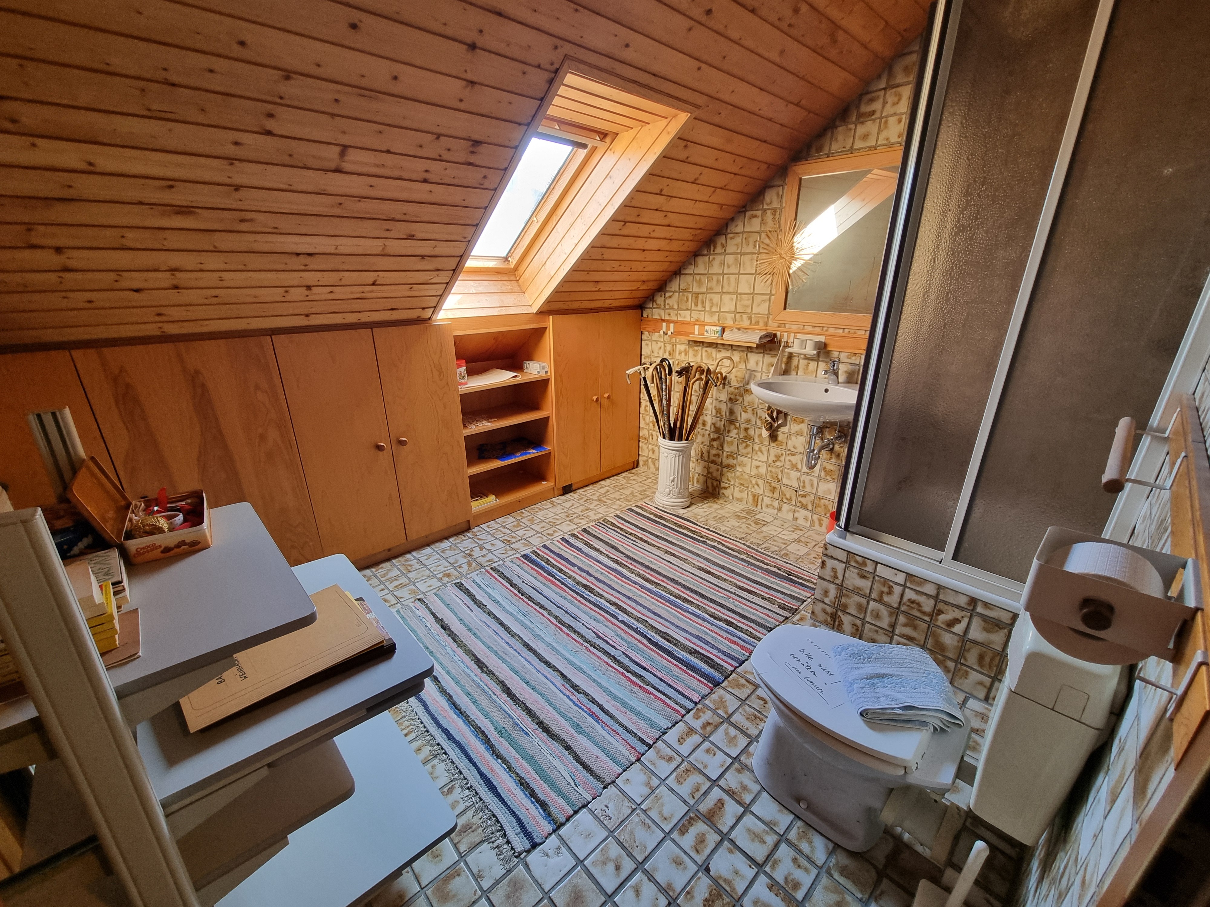 Im Obergeschoss finden Sie drei Schlafzimmer und einen Balkon, ebenfalls Richtung Süden. Das Badezimmer im Obergeschoss ist mit zwei Waschbecken, einer Dusche, einer Wanne und einem WC ausgestattet. Ein weiteres Badezimmer befindet sich im ausgebauten Dachgeschoss, das auch ein großes Dachstudio-Zimmer beherbergt – ideal als Arbeitszimmer, Gästezimmer oder Hobbyraum.