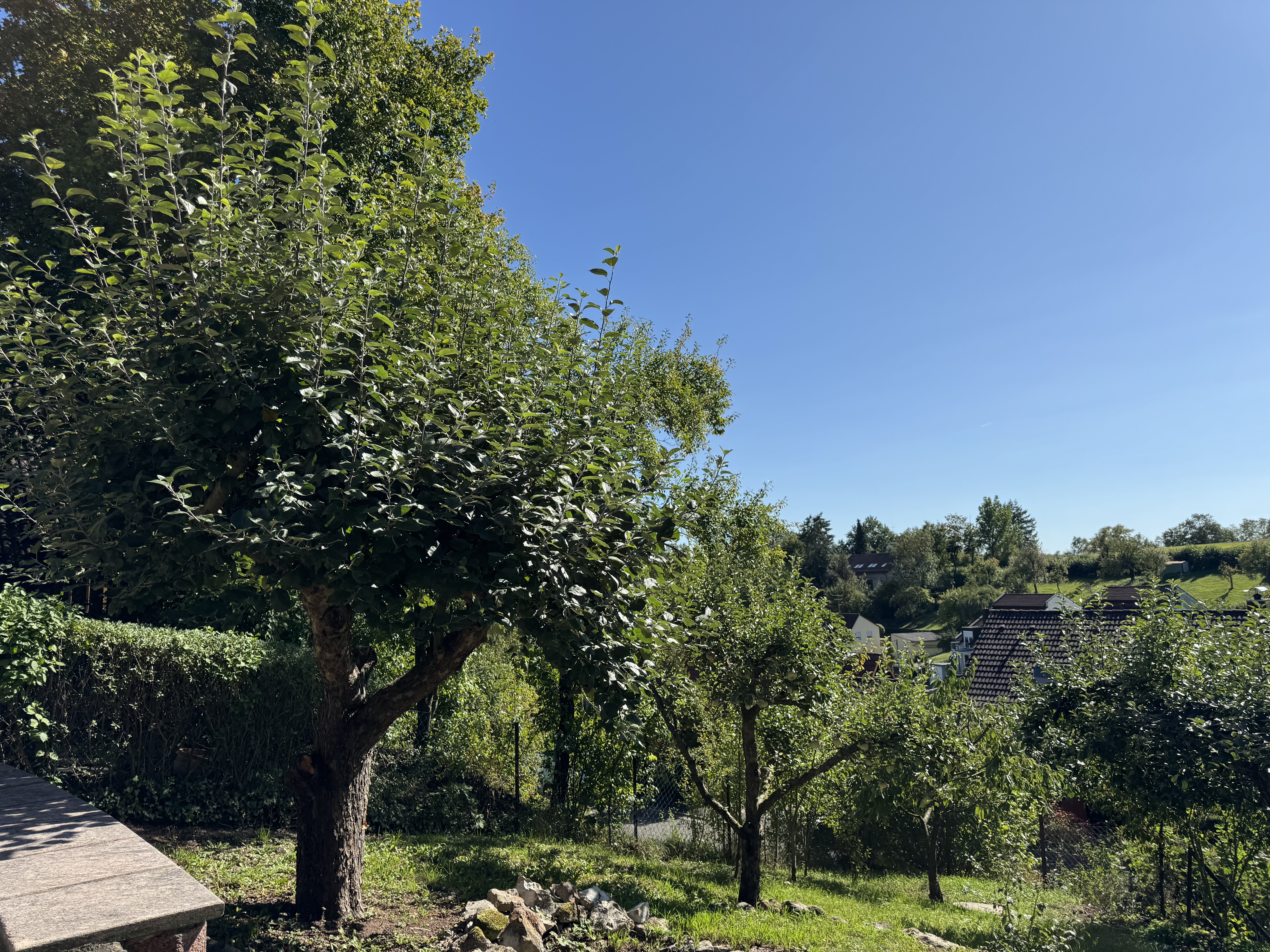 Die liebevoll angelegte Gartenanlage begeistert mit viel Grün und verschiedenen Obstbäumen, die für ein idyllisches Ambiente sorgen.
