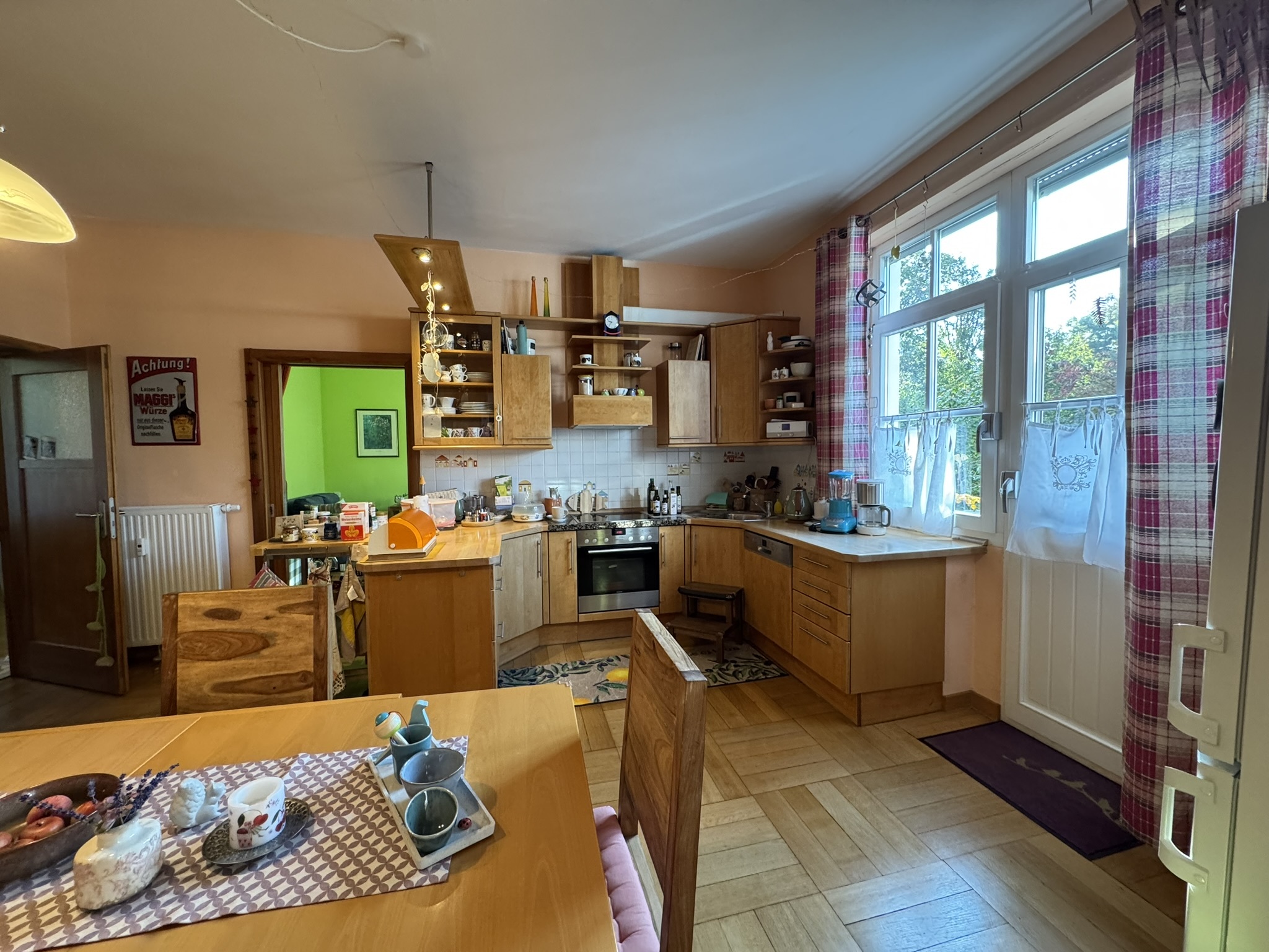 - Wohnfläche: ca. 126 m² - Baujahr: 1937 - Erdgeschosswohnung - Gepflegter Parkettboden in den Wohnräumen - Tageslichtbad mit Dusche und Badewanne - Einbauküche mit allen Geräten (im Preis enthalten) - Heller Wintergarten mit Blick in den Garten - Wunderschöner, gepflegter Garten mit viel Privatsphäre - Kachelofen für wohlige Wärme in der kalten Jahreszeit - Gaszentralheizung - Solaranlage zur Warmwasseraufbereitung - Kellerraum vorhanden - Garagenstellplatz und zwei Aussenstellplätze