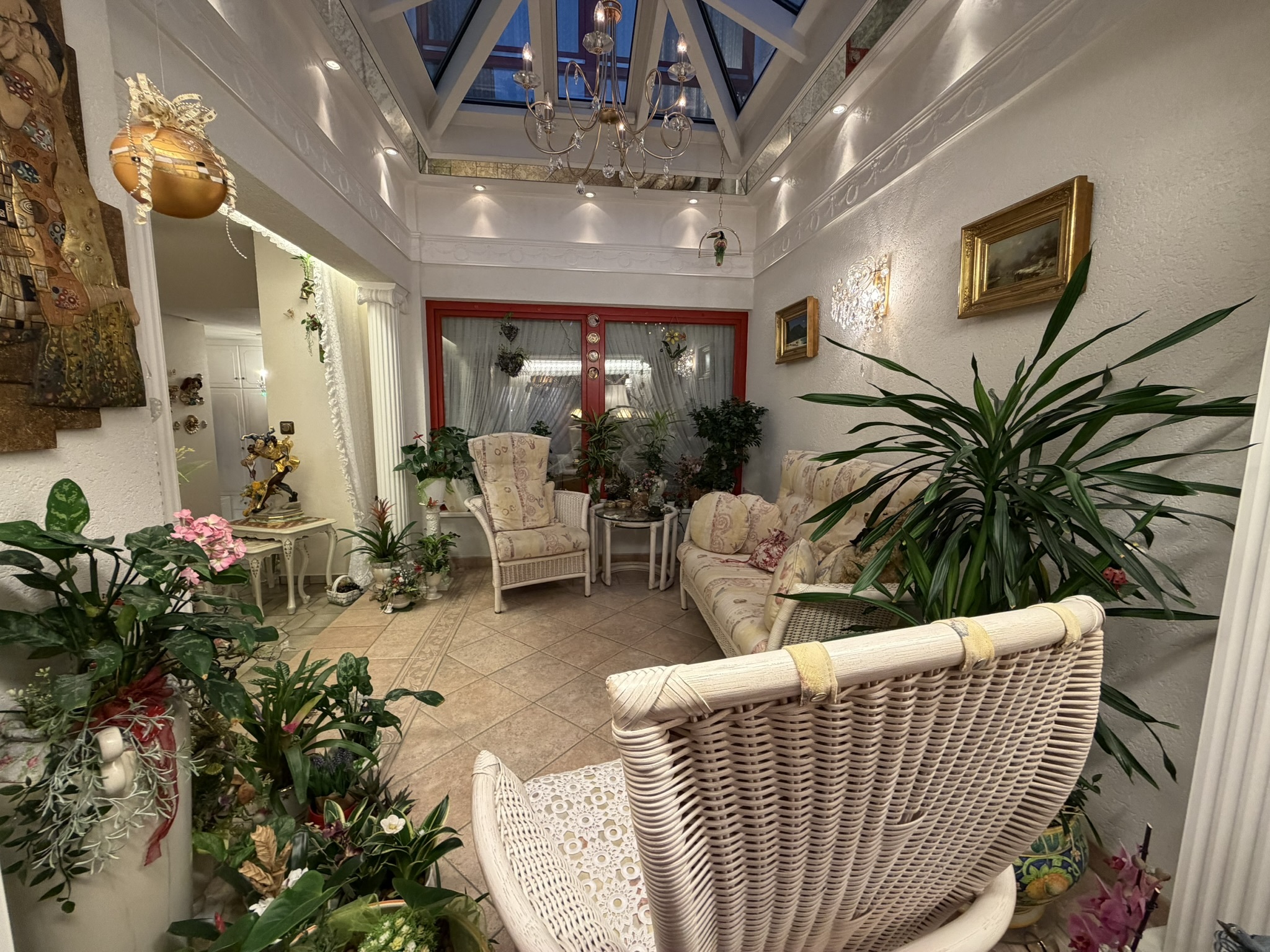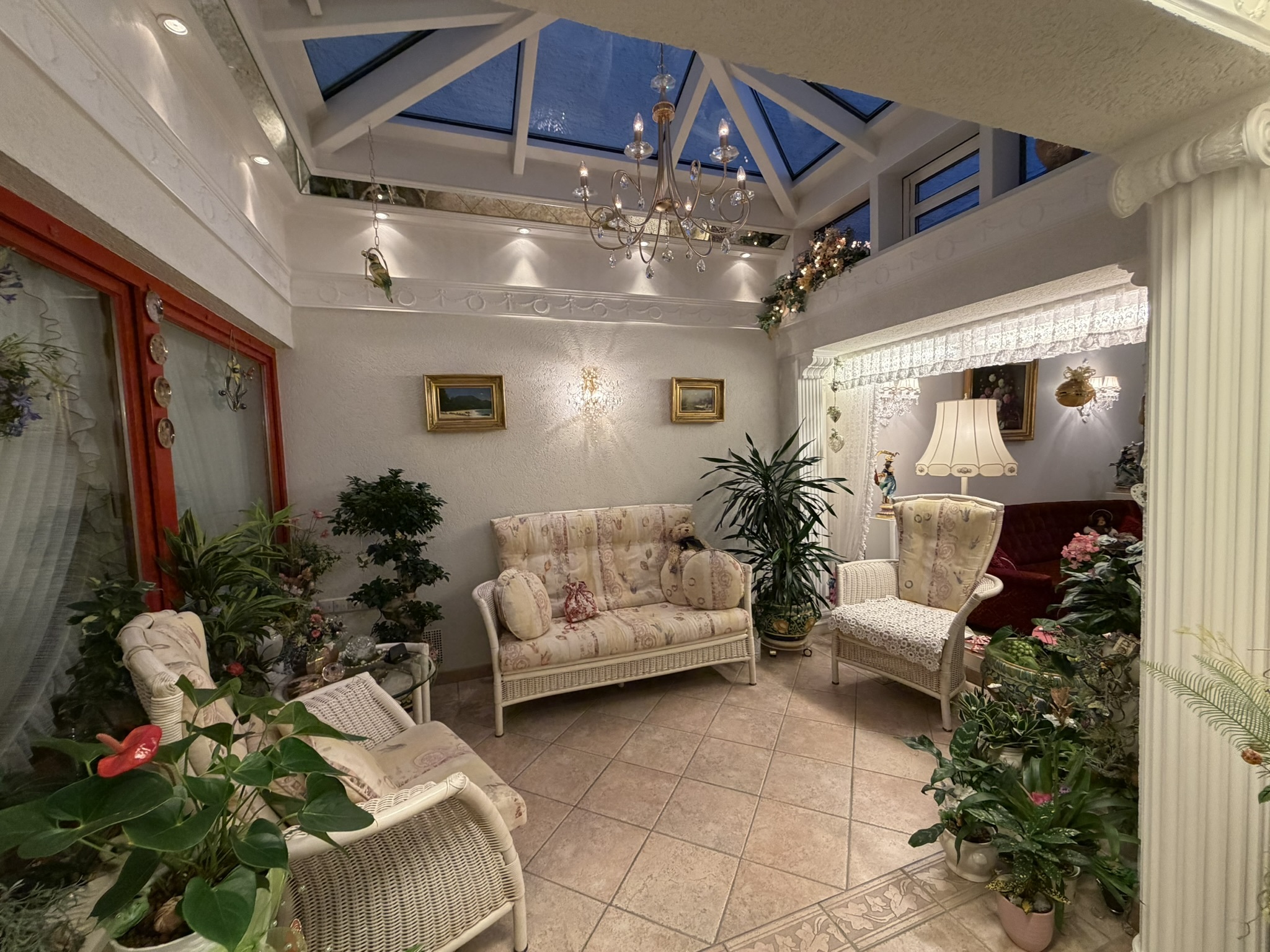 Der überdachte Wintergarten, der direkt an das Wohnzimmer anschließt und für ein lichtdurchflutetes, gemütliches Ambiente sorgt.