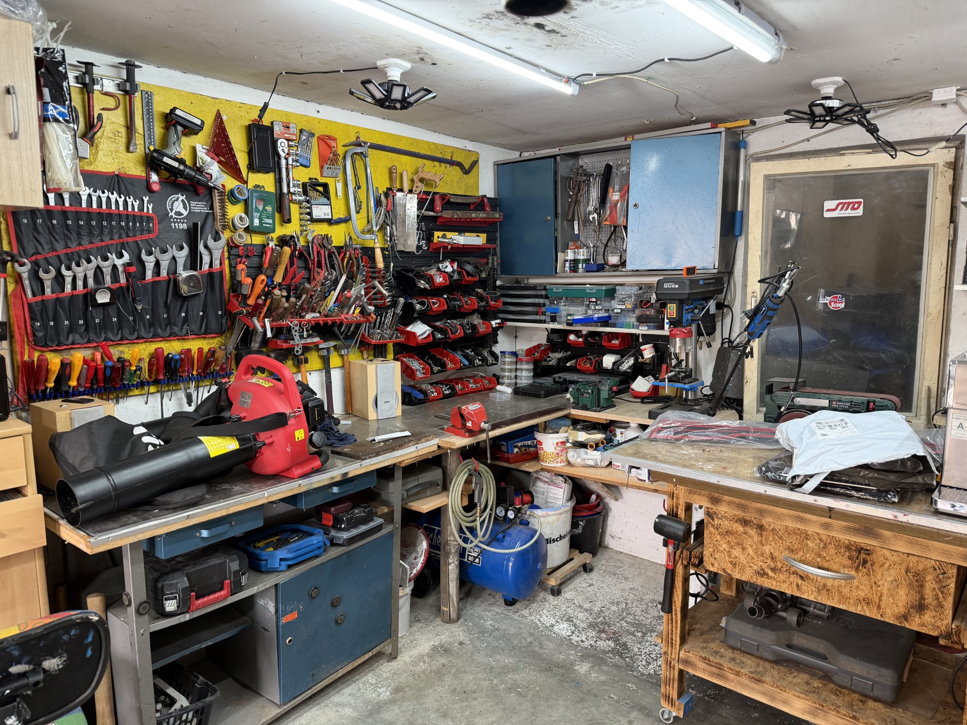 Eine abgeschlossene Garage mit ausgestatteter Werkstatt gehört zur Wohnung dazu.