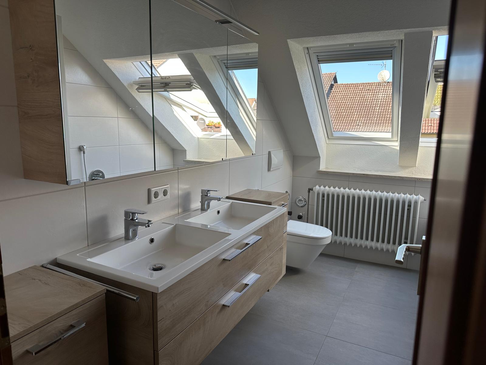 Ein besonderes Highlight ist das komplett neu gestaltete Badezimmer in hochwertiger Ausführung. Mit einer breiten, nahezu ebenerdigen Dusche, einer modernen Doppelsitzbadewanne sowie einem praktischen Doppelwaschbecken verwandelt es sich in eine echte Wellnessoase.