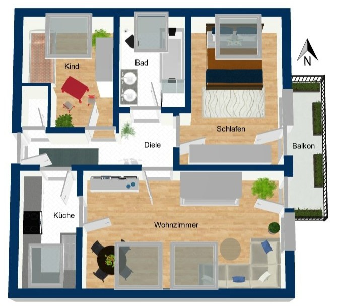 Die modern geschnittene Wohnung überzeugt durch ihre helle und freundliche Atmosphäre. Herzstück ist das großzügige Wohn- und Esszimmer mit direktem Zugang zum Balkon, der ebenfalls vom Schlafzimmer aus begehbar ist.