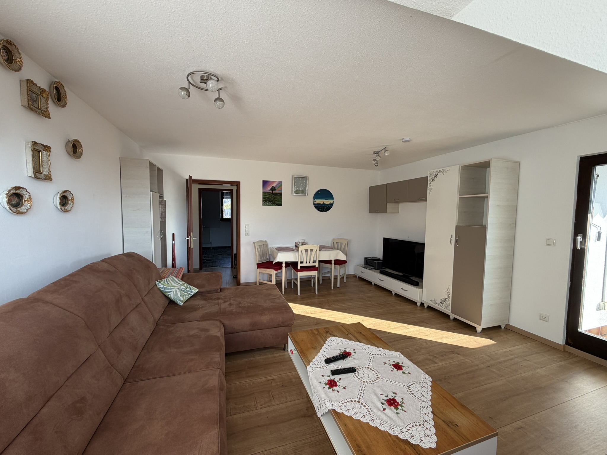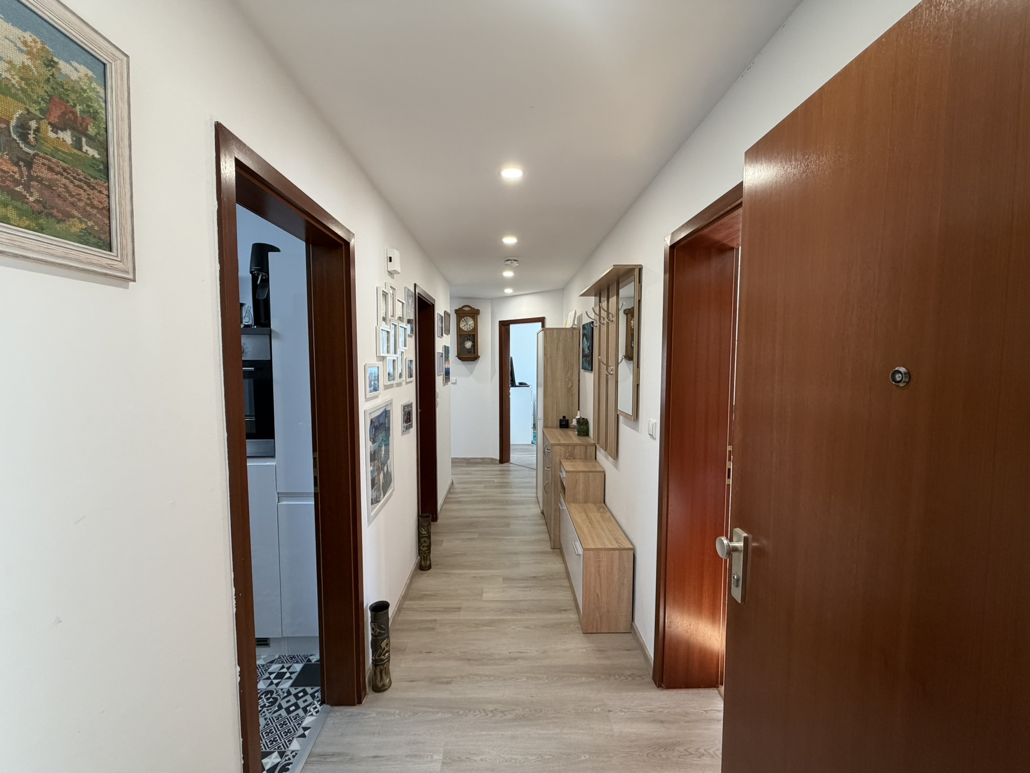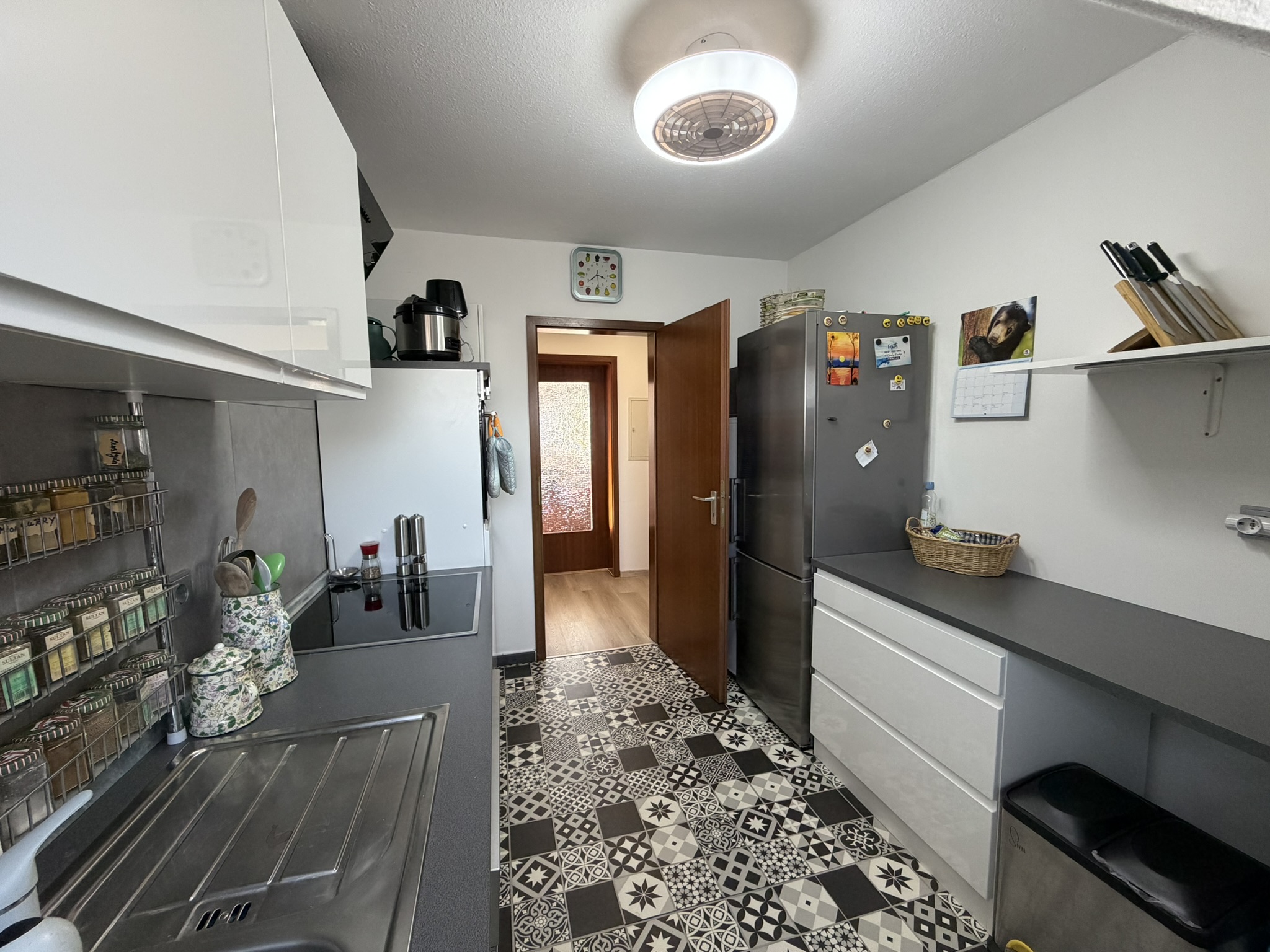 Der großzügige Wohnbereich öffnet sich zur großen Loggia, die viel Platz für Erholung im Freien bietet. Die Einbauküche, ausgestattet mit allen Geräten, ist harmonisch in den Wohnalltag integriert und bietet alles, was man für den täglichen Gebrauch benötigt.